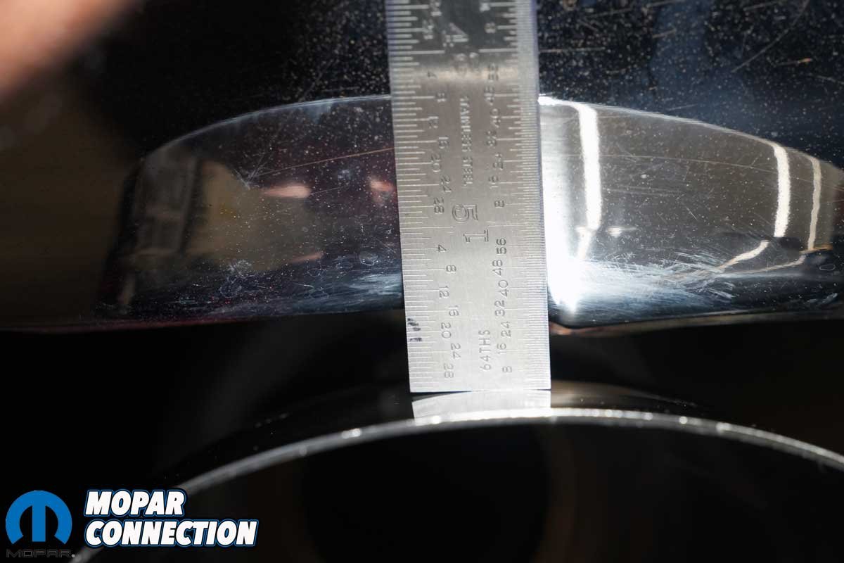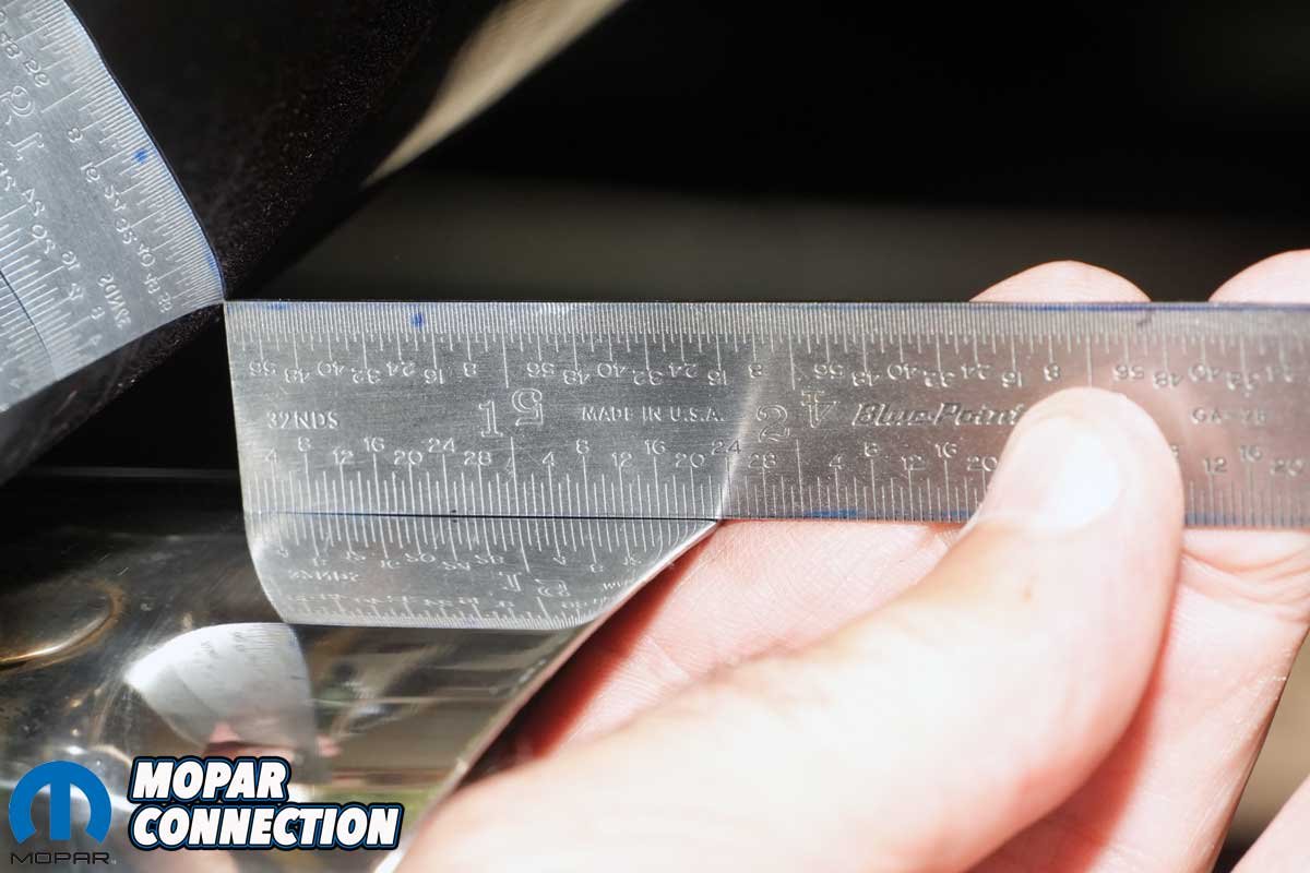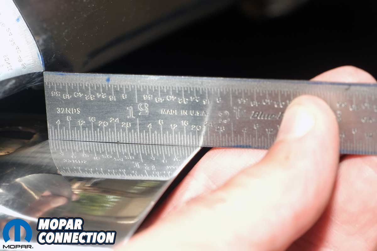 Above Left: The left rear exhaust tip extended 21⁄32-inch beyond the bumper. Above Right: The right rear tip extended 22⁄32-inch, a 1⁄32-inch difference that was acceptable.