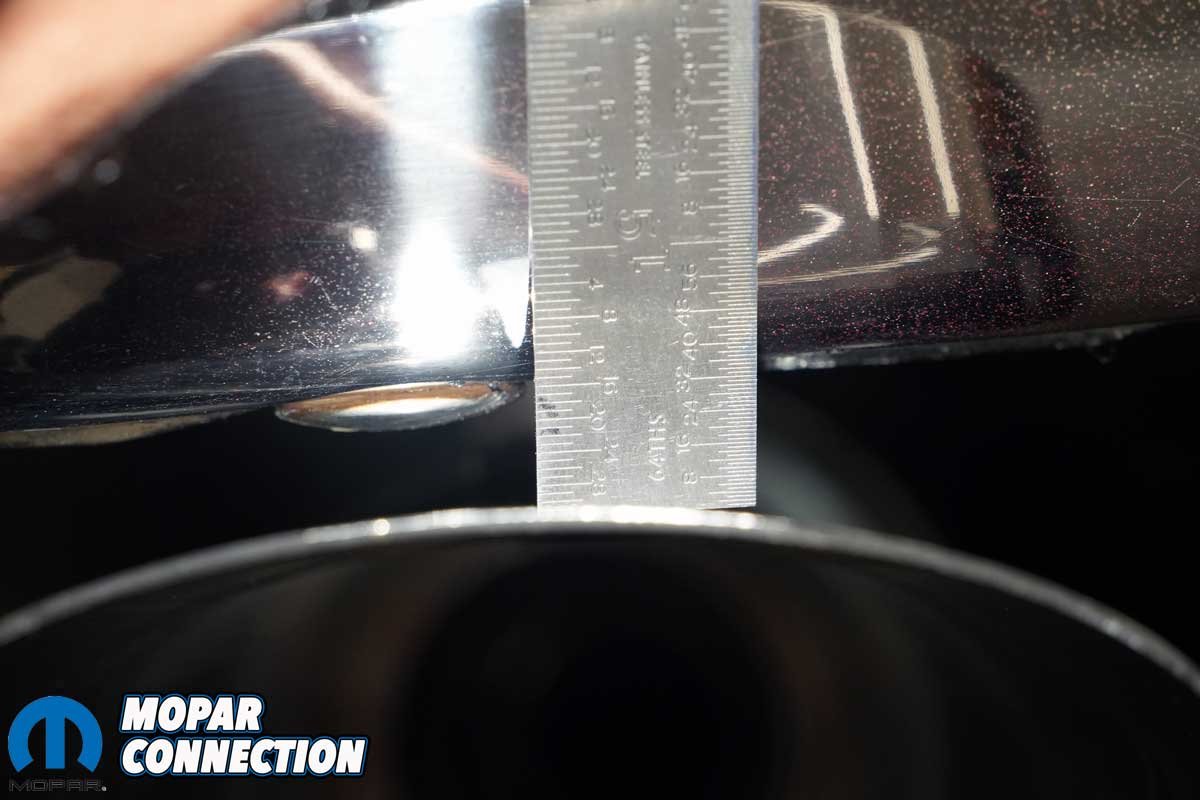 Above: We aimed for a 1/2-inch gap between the bumper and each exhaust tip. Both tips were adjusted to achieve this clearance, which required gently bending the mounting tabs that fit into the exhaust tip mounting grommets.