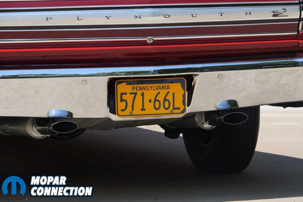 With the system fully installed, we fired up the 426 Hemi. The engine settled into a deep, mellow idle with that unmistakable Mopar rhythm. Inside the car, the tone was smooth and period-correct, not boomy or droning, but with enough bark outside to remind everyone this is a Hemi-powered Road Runner.