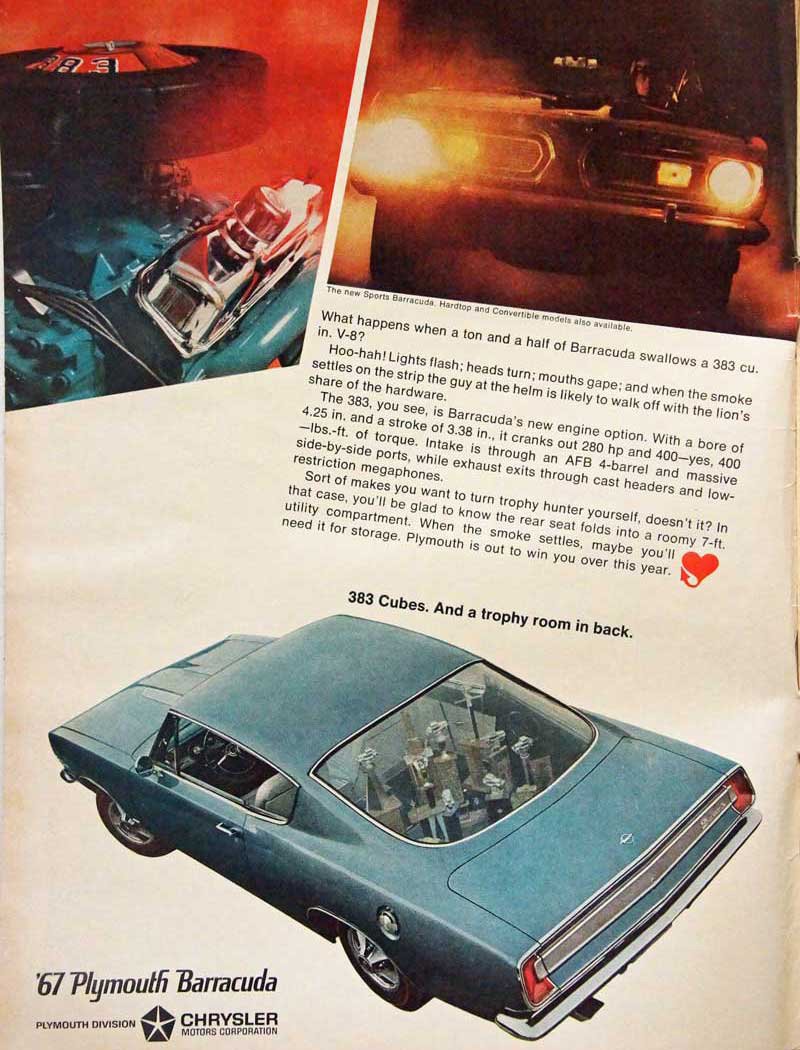 Schulte and Ramsey worked for the ad agency Young and Rubicam (Y&R). With the new ’67 Barracuda rolling off the assembly lines in the fall of ‘66, Y&R, in competition with several other agencies, earned Plymouth’s business when recently hired Ramsey came up with the tagline “Plymouth Is Out to Win You Over.”