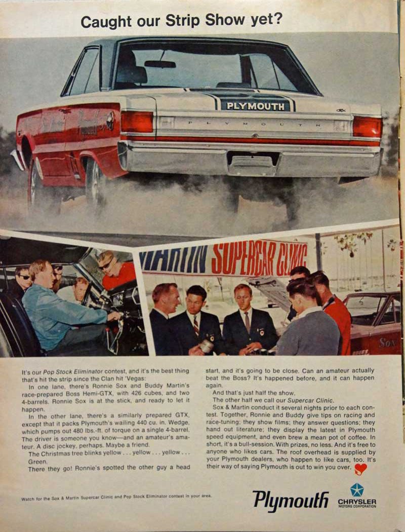 Not only was Ramsey a copywriter for the Barracuda marketing, but he also worked on the GTX campaign and material for Supercar Clinics of the Super Stock and later Pro Stock team of Ronnie Sox and Buddy Martin (Sox and Martin).