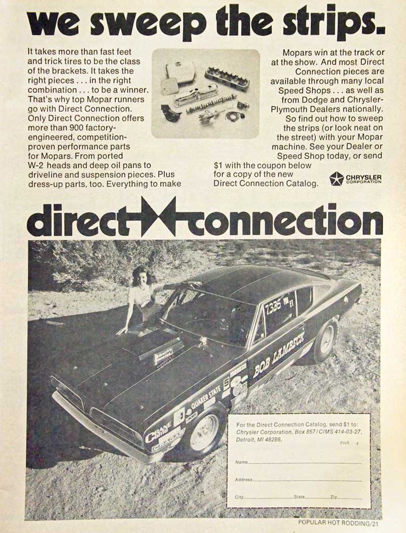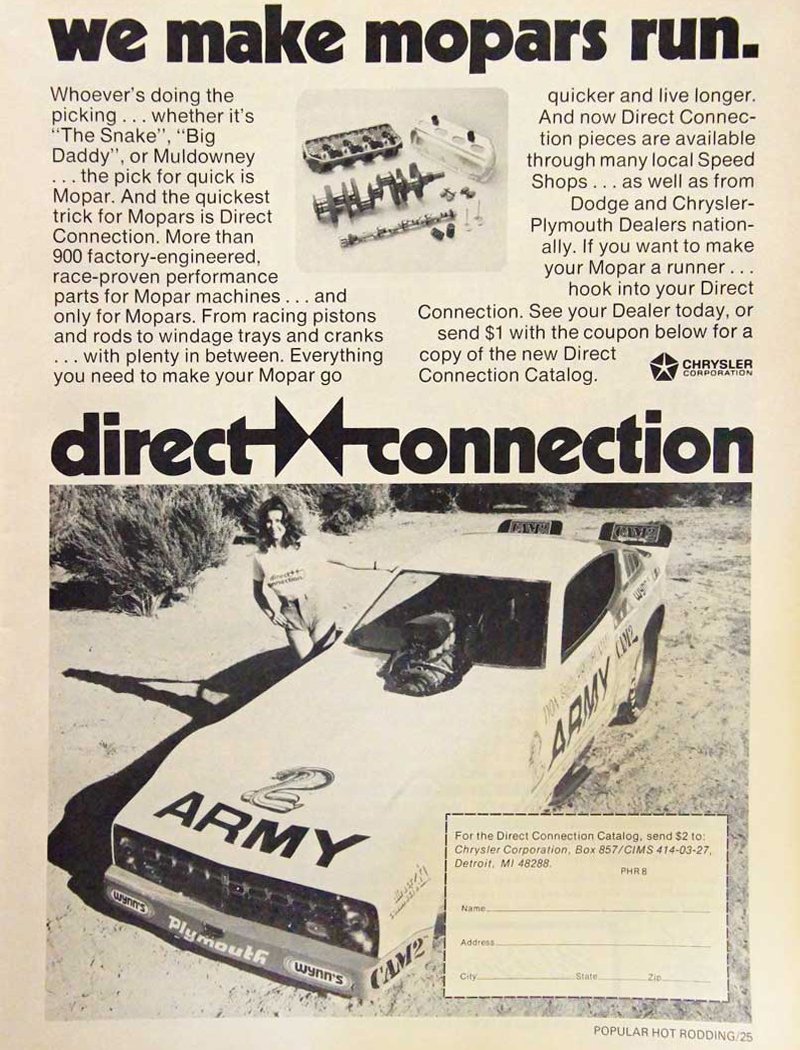 The Direct Connection project’s roots can be traced back to the Rapid Transit System campaign that Ramsey and Schulte developed in 1970. The Rapid Transit System incorporated Plymouth muscle cars, factory race parts, tuning tips, tech bulletins, and performance clinics operated by Sox and Martin and Grotheer. In 1974, when Direct Connection was established, Chrysler was the only manufacturer providing its enthusiasts a racer’s access to performance parts and knowledge.