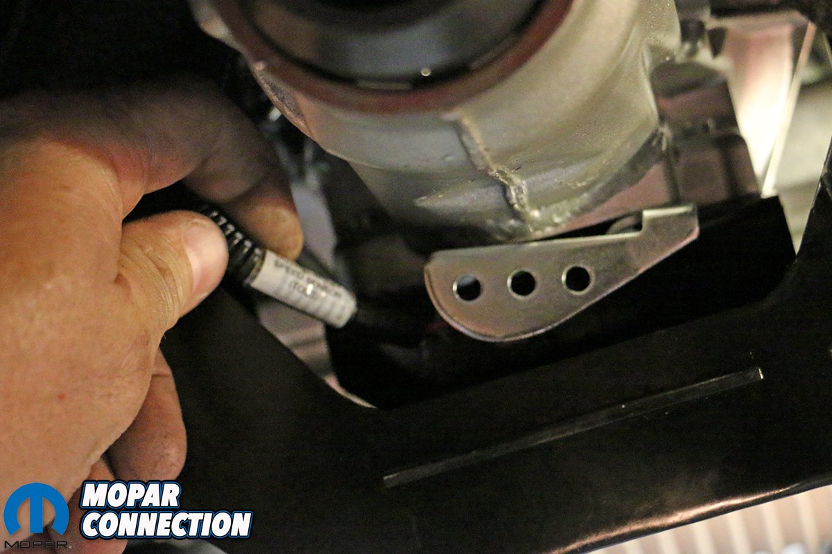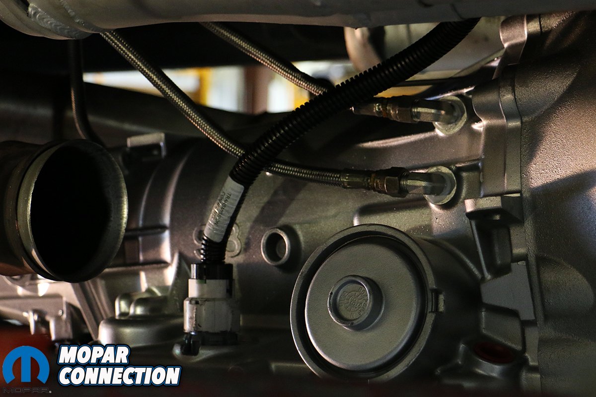 Yet most impressively, the kit requires zero cutting to the car, only some slight body contouring to clearance the large shift solenoid on the passenger side transmission tunnel. “We ensure that you can still use your factory center console and shifter position,” Jack Silver assured. A paper template is provided to clearly mark where (and how deep) the indentation needs to be made. The A41 surprisingly is more narrow than the 727, but at a slight offset, making the large, deep cast aluminum pan hug the passenger side header. Likewise, the the right hand side also receives both cooler lines, which we plumbed directly into our Be Cool radiator and saved SST the external ATF cooler and lines, as well as the large ECM harness plug.