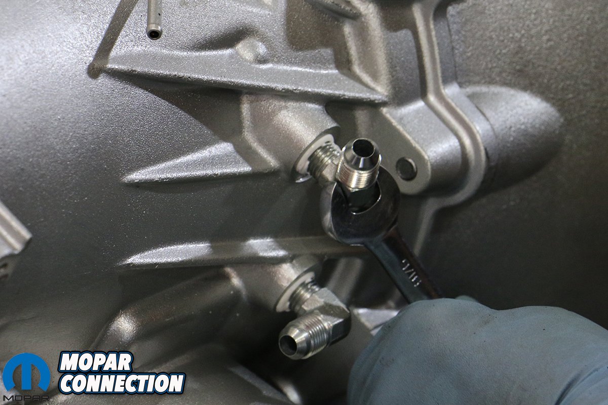 Above left: Because of the tightness of the cooler lines, it’s best to install the supplied 90-degree fittings prior to installing the overdrive. Above right: Likewise, it was easier to attach the cooler lines with the transmission not yet mated to the engine.