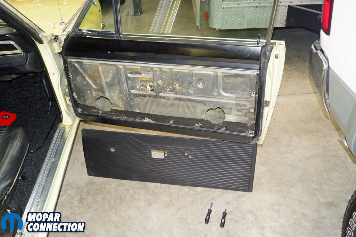 Once the mirror and door handle were installed, we reinstalled the vapor barrier, the door chrome strip, and the door panel. Due to the poor condition of the driver side armrest pad, we picked up a pair of 1967 A-body armrest pads in black (MF1758) and a pair of chrome armrest bases (MA1532). We retrieved the factory mounting screw that had previously been removed from the old armrest and installed it onto our new assembly.