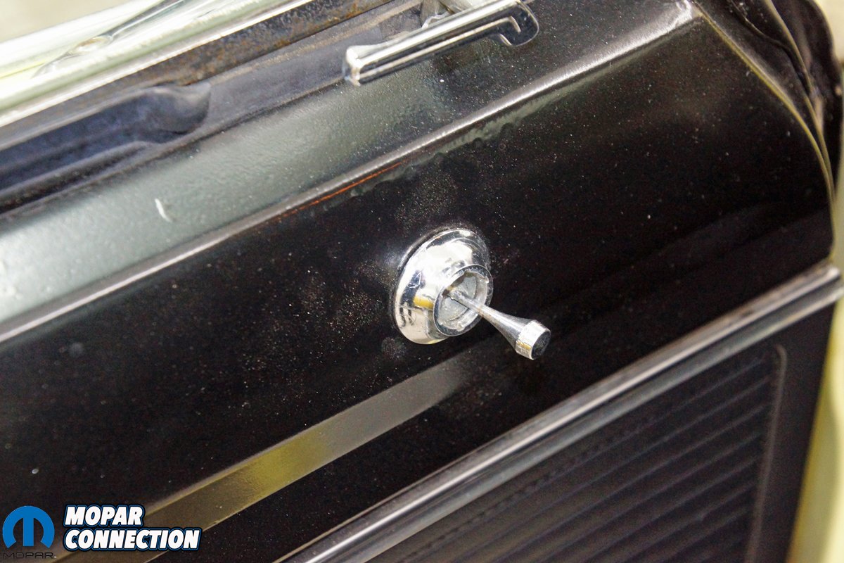 With the armrest reassembled, we installed the armrest base onto the door panel with the factory screws. We reinstalled the cleaned and polished inner door handle, it provided an interference-free operation with the new armrest base. To finish the door, we picked up two pairs of 1967 A- and B-body window crank handles (MD157). We oriented the new crank handle and tightened its mounting screw. After we completed the driver side door, we performed the same procedures (except for the mirror) on the passenger side door. Upon final assembly, all the installed components operated properly.