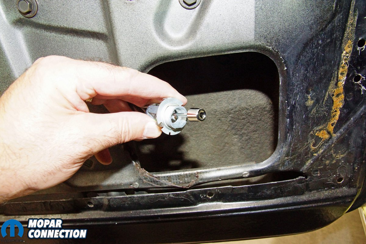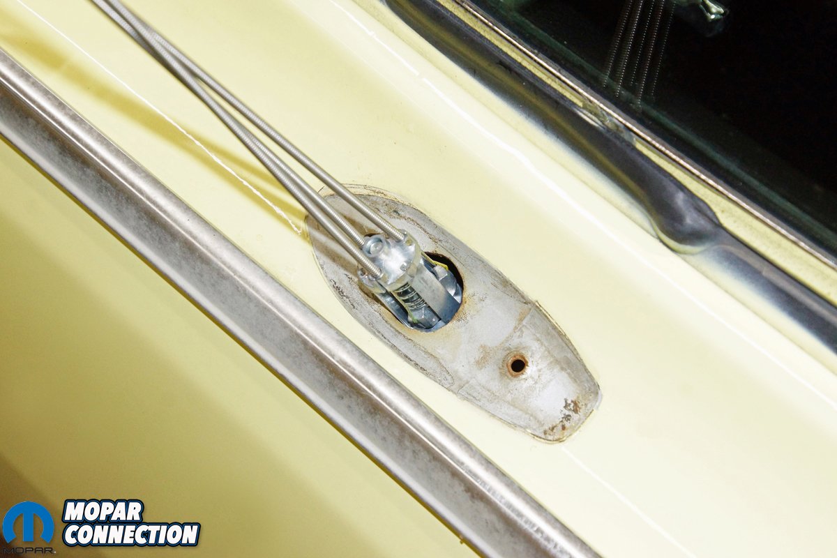 To replace our Dart’s factory remote operated exterior mirror, we selected a 1966-74 A and B-body remote outer door mirror (round type). It came supplied with all the required installation hardware (MD2207). To remove the mirror, we unthreaded the collar nut from the control lever mounted on the interior side of the door. We pushed the control lever (and attached cables) through the mounting hole and into the door cavity.
