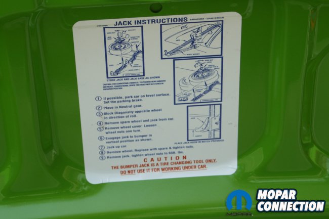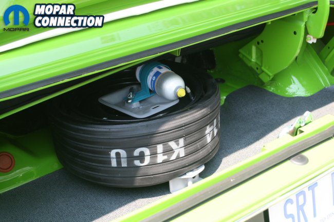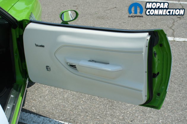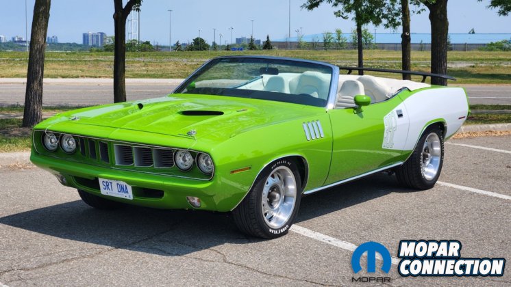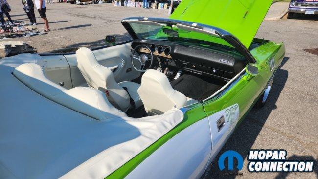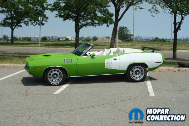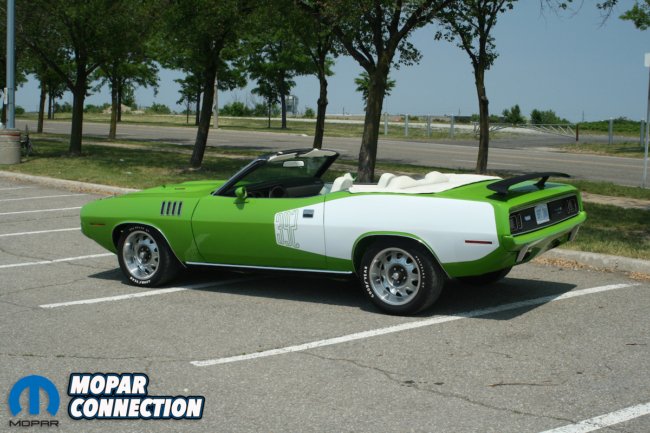 The ‘Cuda is equipped with Nitto NT555 225/50R 17s up front on 8-inch YearOne 17″ Rallye retro rims and 255/50R 17s in the rear on 9-inch rims. To give the tires an even more vintage look, Goodyear Polyglas lettering was added. With upgraded suspension, the convertible rides beautifully.