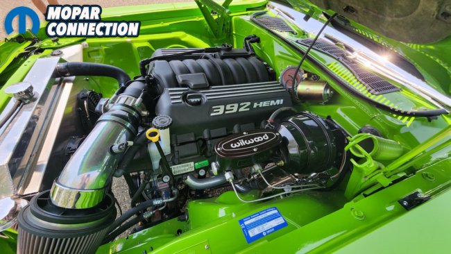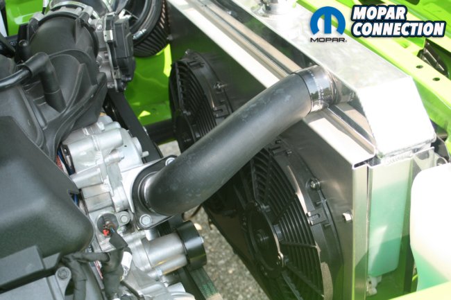 Alan called the local Georgetown Dodge dealership to order a new Crate 392 engine. Alan kept the engine pretty much stock as it had more than ample horsepower. The 392 (6.4 liter) puts out about 485 horsepower and 475 lb-ft of torque. He added a custom cold-air intake. The reason for using TTI headers is that they do have one for the Gen III Hemi application that fits the E-bodies. To keep the 392 Hemi cool, a Frostbite aluminum radiator was added with dual electric fans.