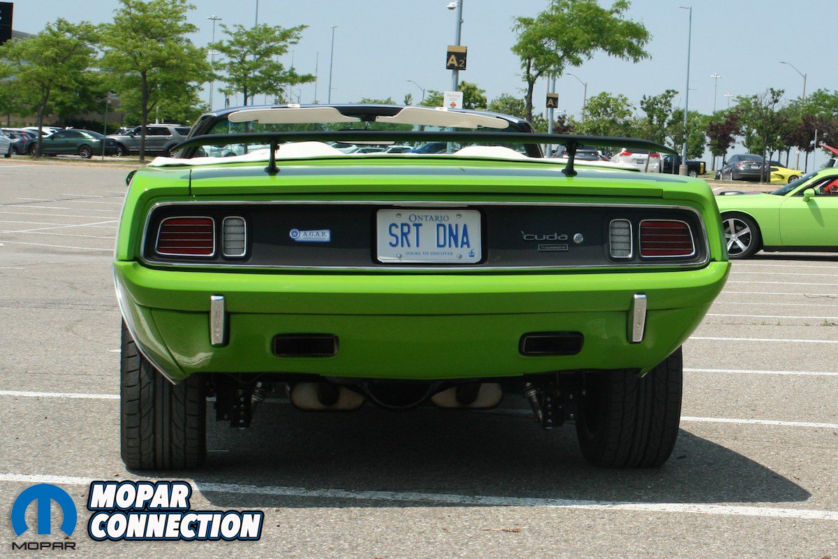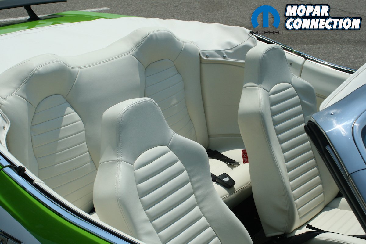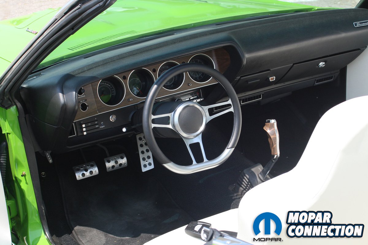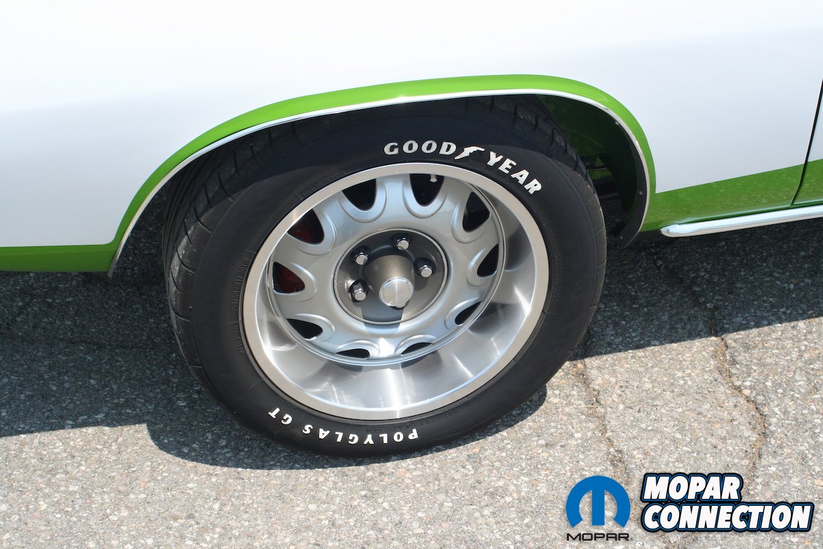 The ‘Cuda is equipped with Nitto NT555 225/50R 17s up front on 8-inch YearOne 17″ Rallye retro rims and 255/50R 17s in the rear on 9-inch rims. To give the tires an even more vintage look, Goodyear Polyglas lettering was added. With upgraded suspension, the convertible rides beautifully.