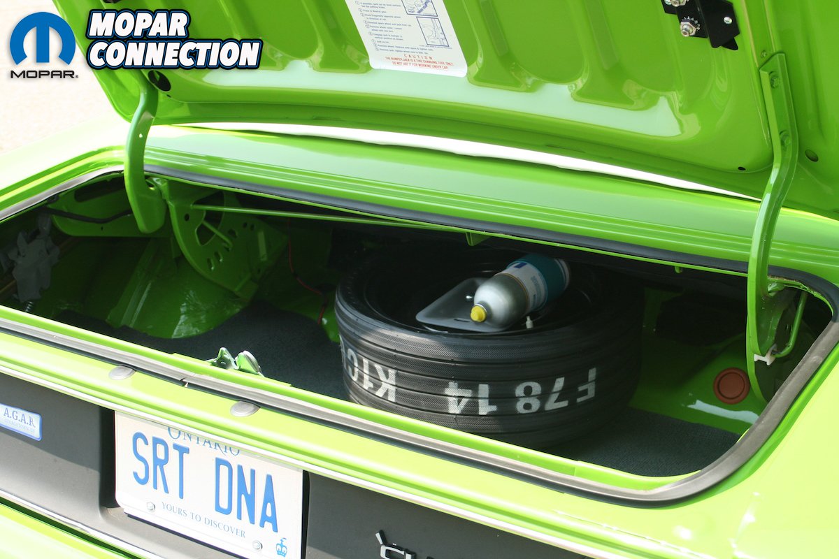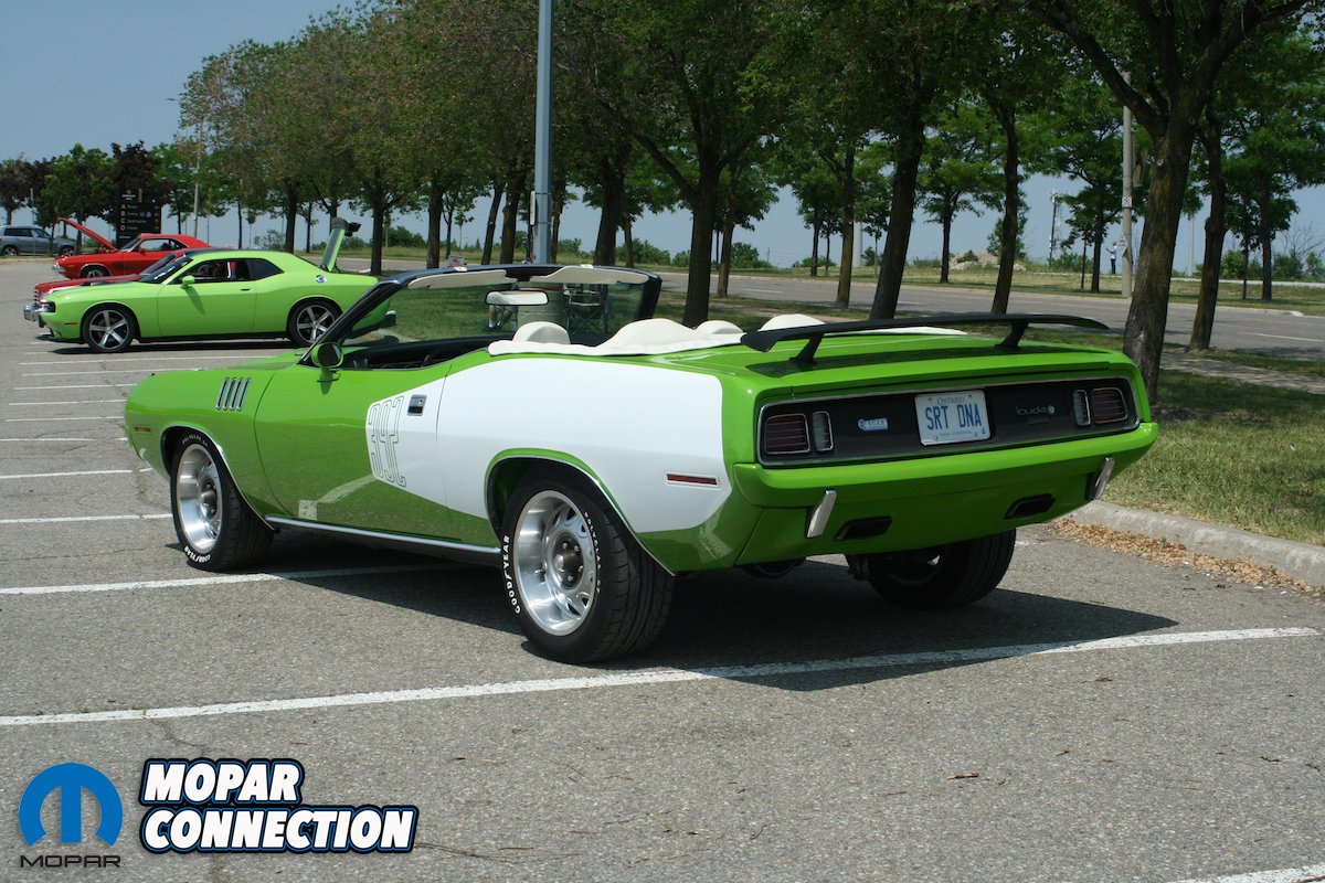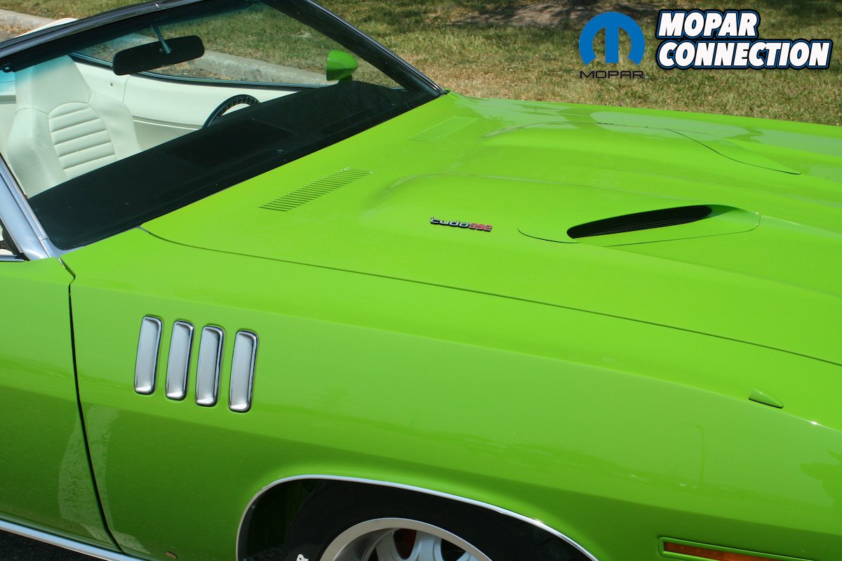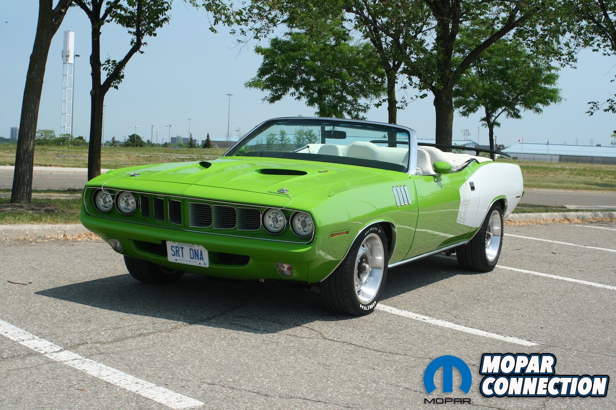 The ‘Cuda is equipped with Nitto NT555 225/50R 17s up front on 8-inch YearOne 17″ Rallye retro rims and 255/50R 17s in the rear on 9-inch rims. To give the tires an even more vintage look, Goodyear Polyglas lettering was added. With upgraded suspension, the convertible rides beautifully.