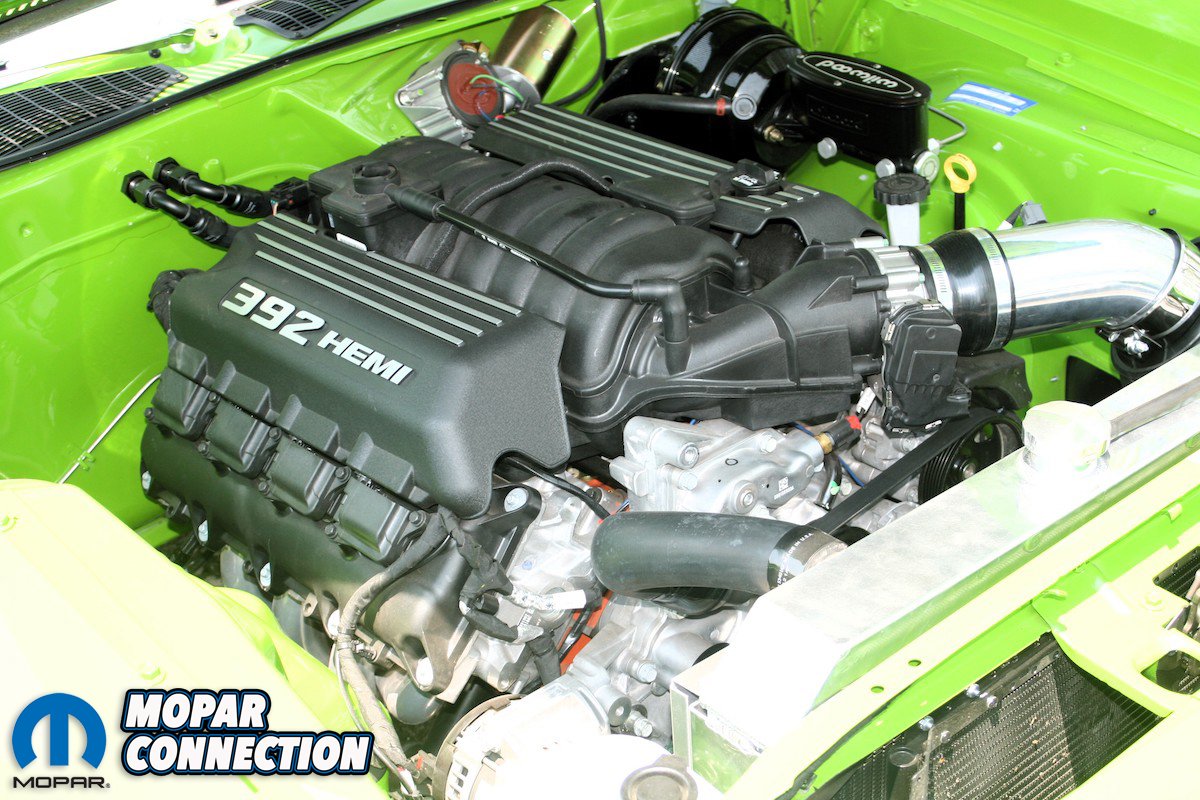 Alan called the local Georgetown Dodge dealership to order a new Crate 392 engine. Alan kept the engine pretty much stock as it had more than ample horsepower. The 392 (6.4 liter) puts out about 485 horsepower and 475 lb-ft of torque. He added a custom cold-air intake. The reason for using TTI headers is that they do have one for the Gen III Hemi application that fits the E-bodies. To keep the 392 Hemi cool, a Frostbite aluminum radiator was added with dual electric fans.
