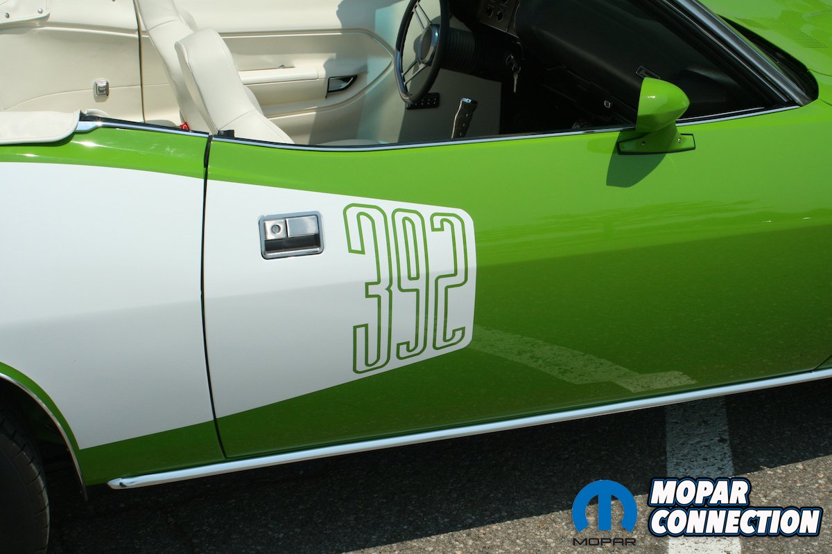 A custom white billboard stripe featuring a 392 callout was added to the Sassy Grassy green paint to complete the ensemble. Modern upgrades include headlights from Dapper Lighting, with halo rings to be used as daytime running lights. Alan went with a white top to add to the look of this awe-inspiring car.