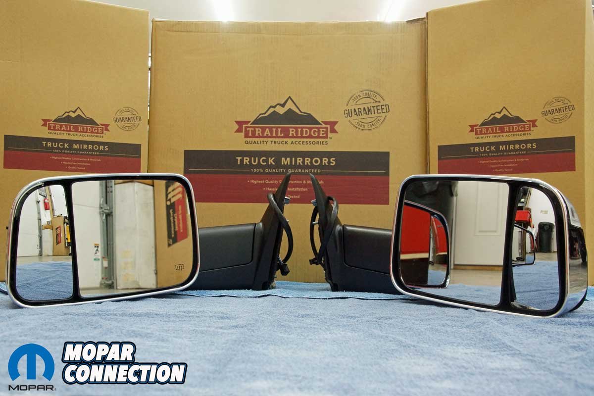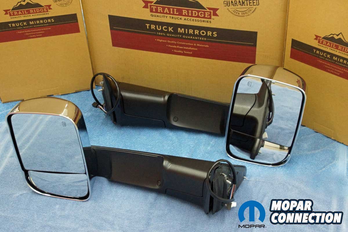 The Trail Ridge mirrors arrived with the correct wire harness connectors for our power-adjustable mirrors. Additionally, there were proper harness wires for the heater/defrost, turn signals, and puddle lights. The Trail Ridge mirrors are durable automotive-grade ABS plastic with an OEM textured black finish and chrome mirror covers to mimic the factory appearance.