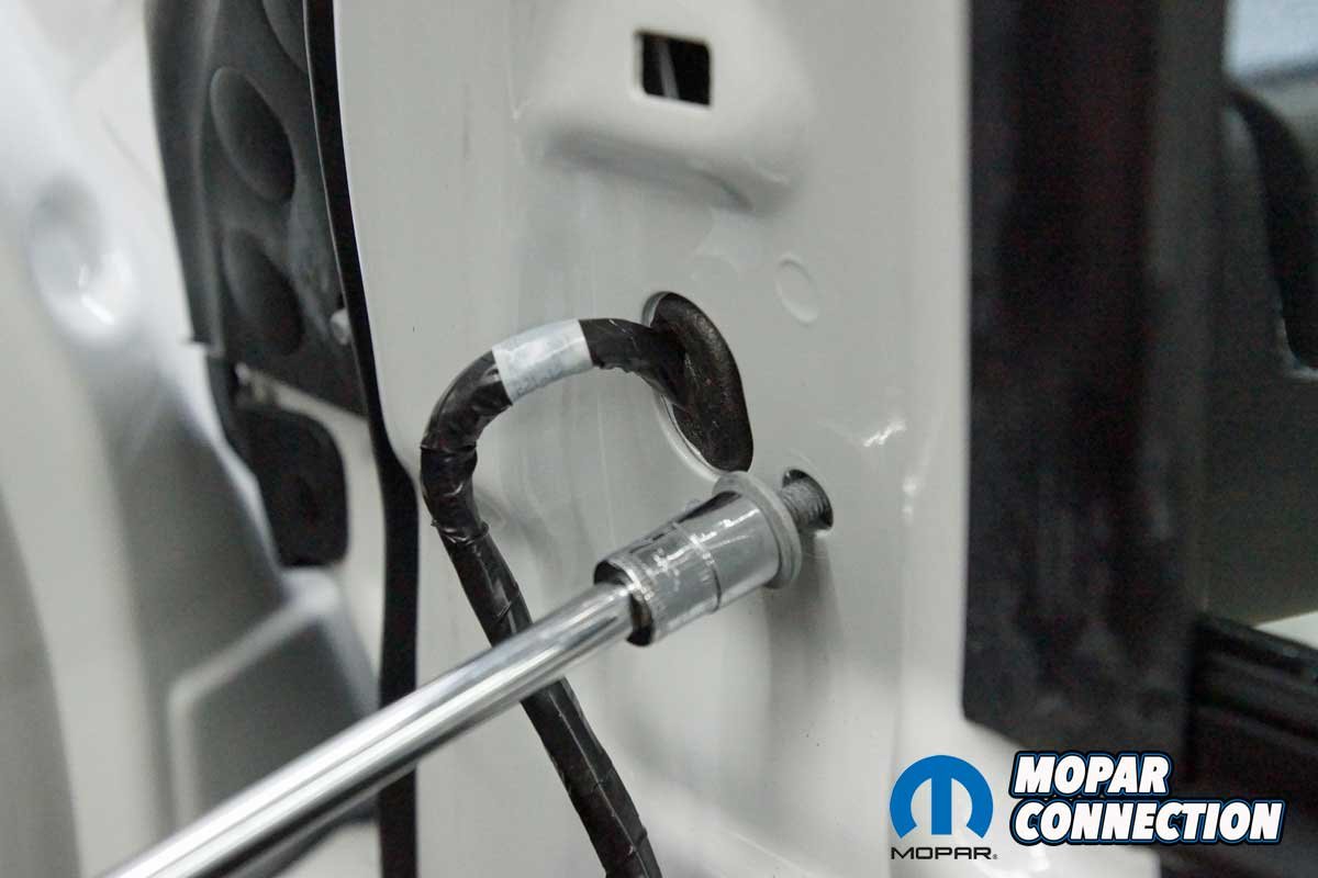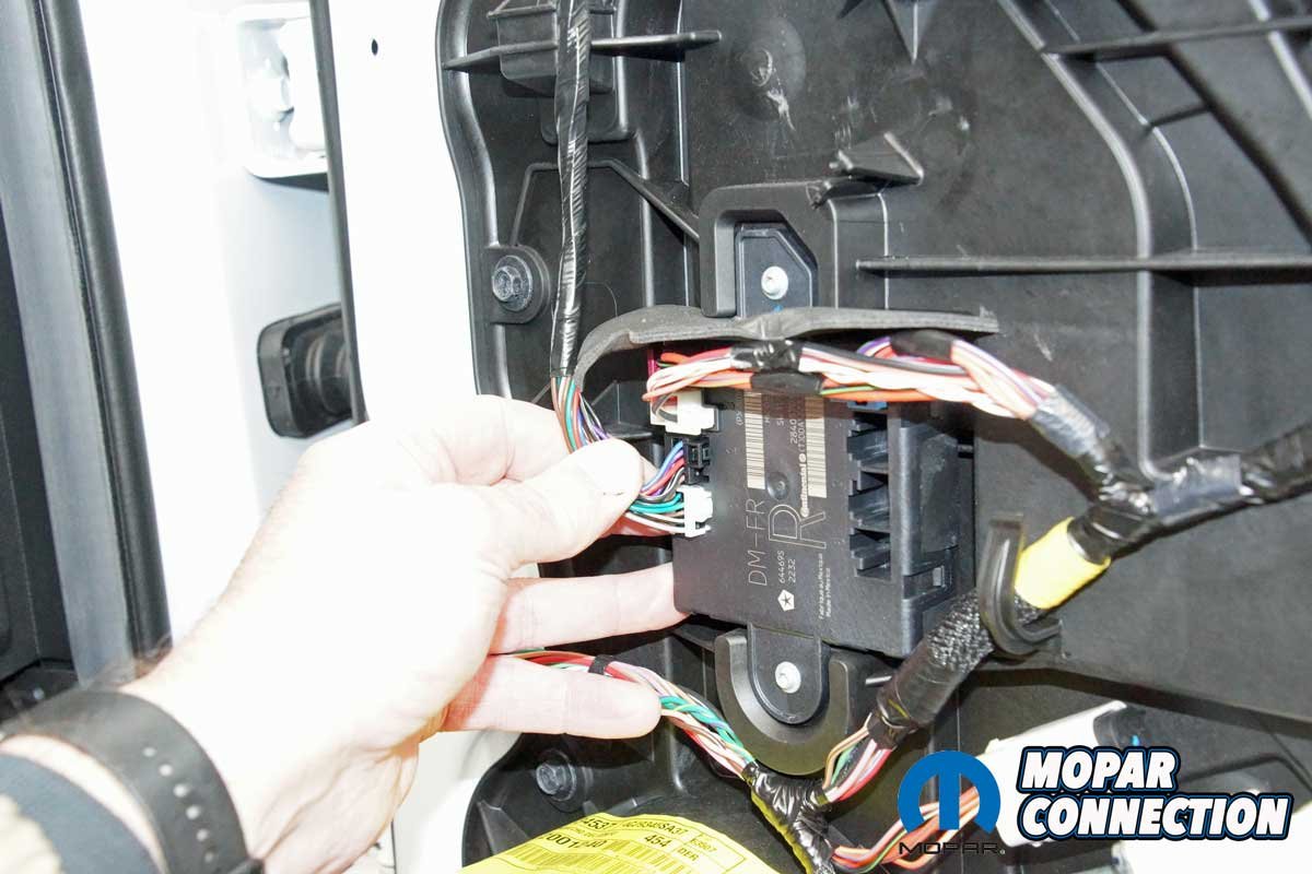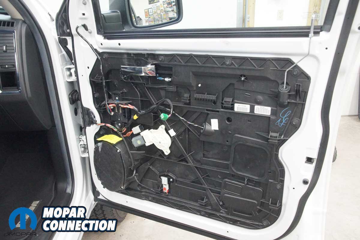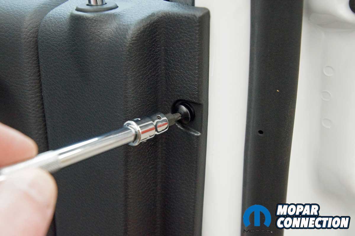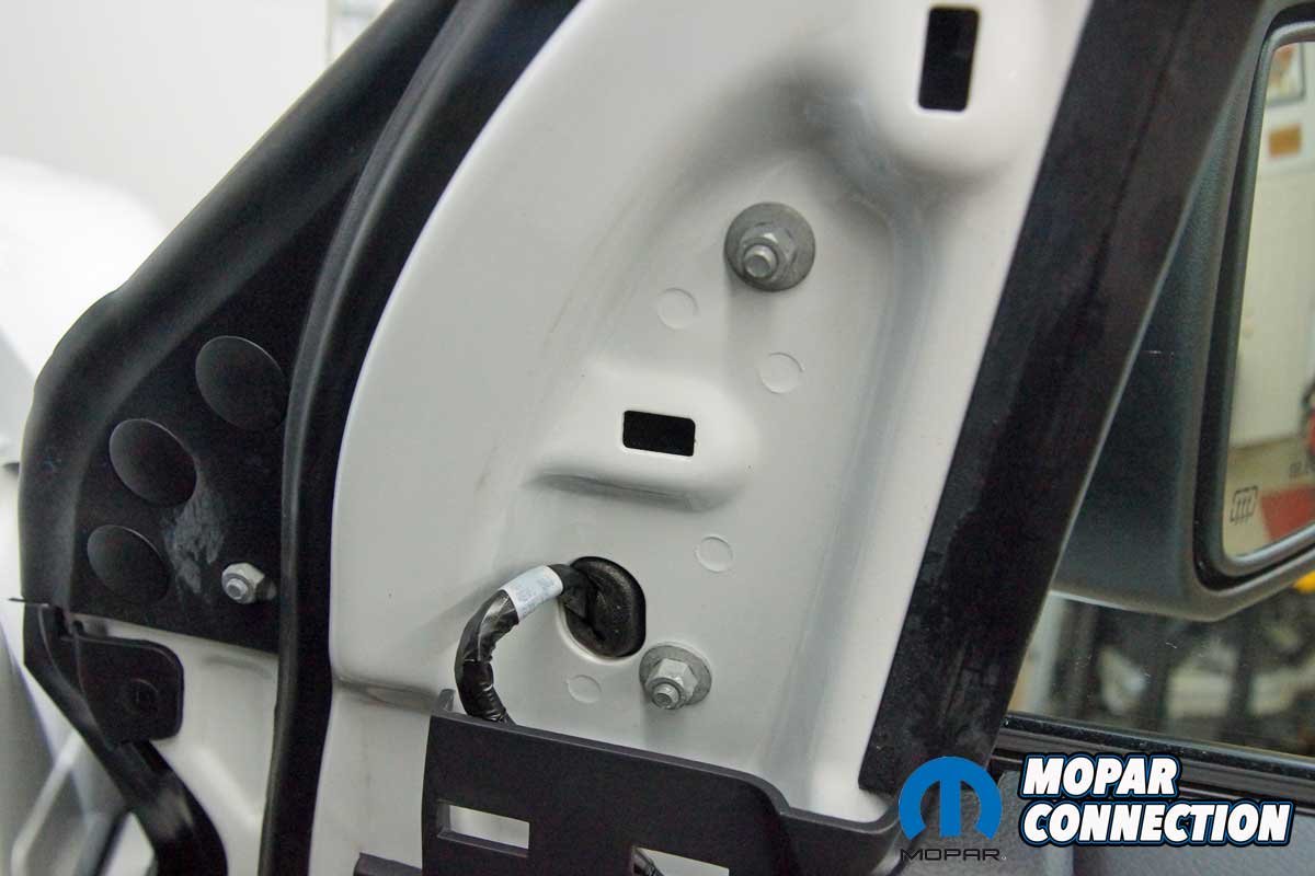 The installation of the mirrors required hand tools and some finesse. Starting with the passenger side door, we removed the mirror flag (Mopar term) from the door with a plastic removal tool, which exposed all three mirror support fasteners. Although the fasteners were visible, the harness connectors were snapped in place deep under the door panel.