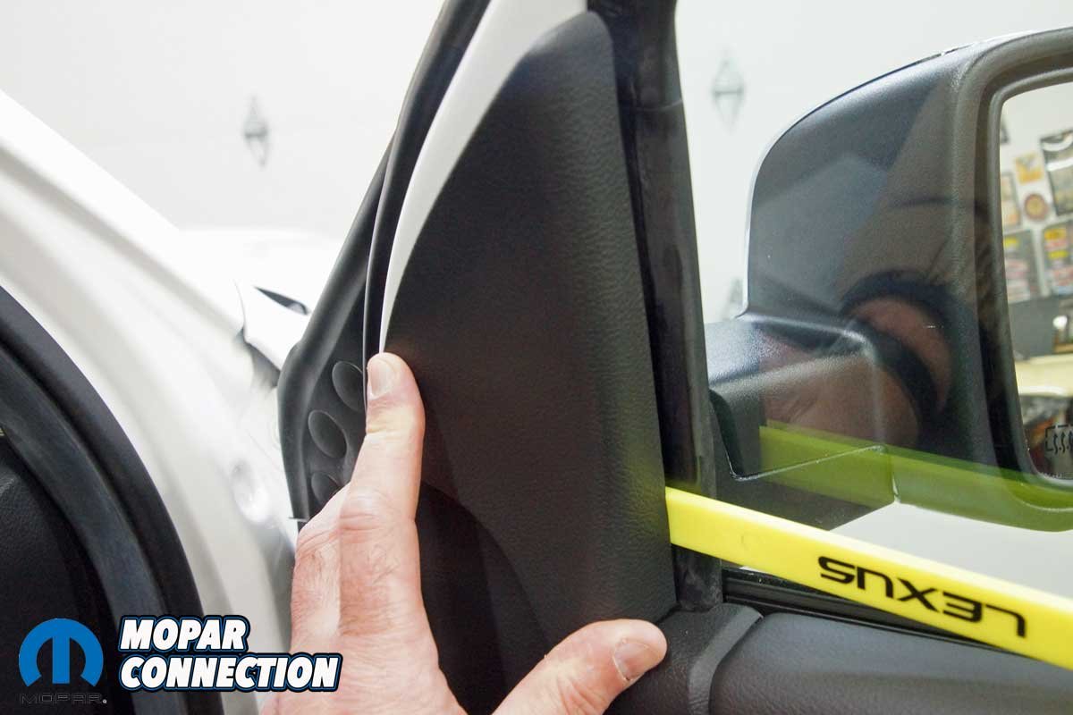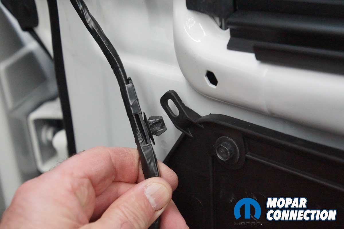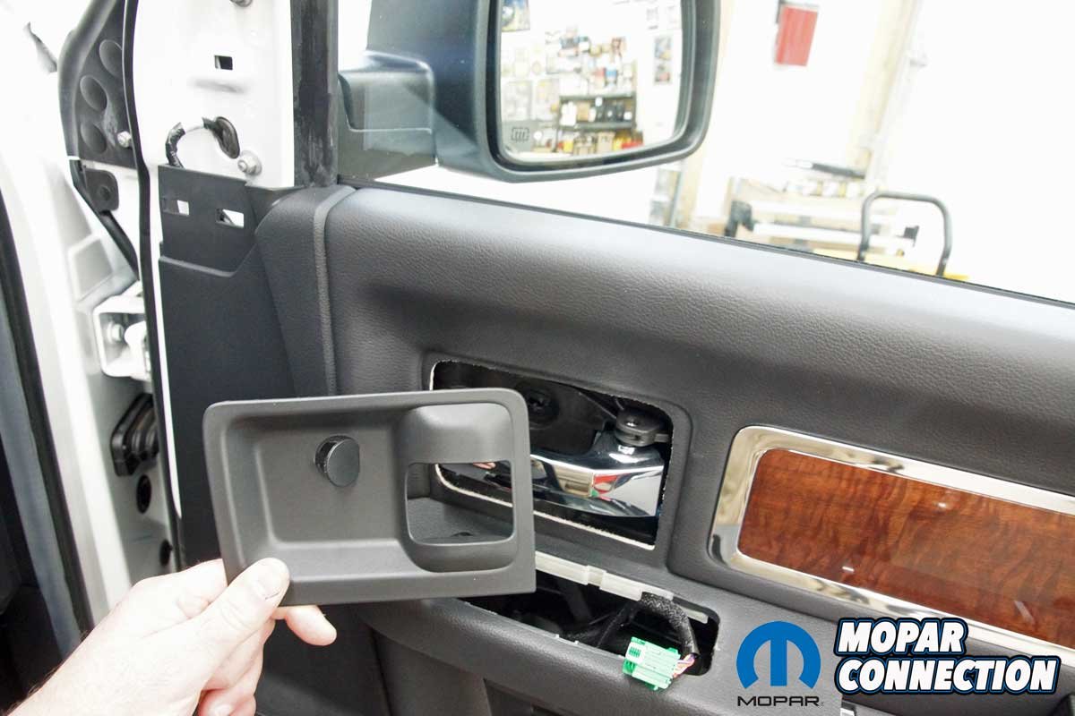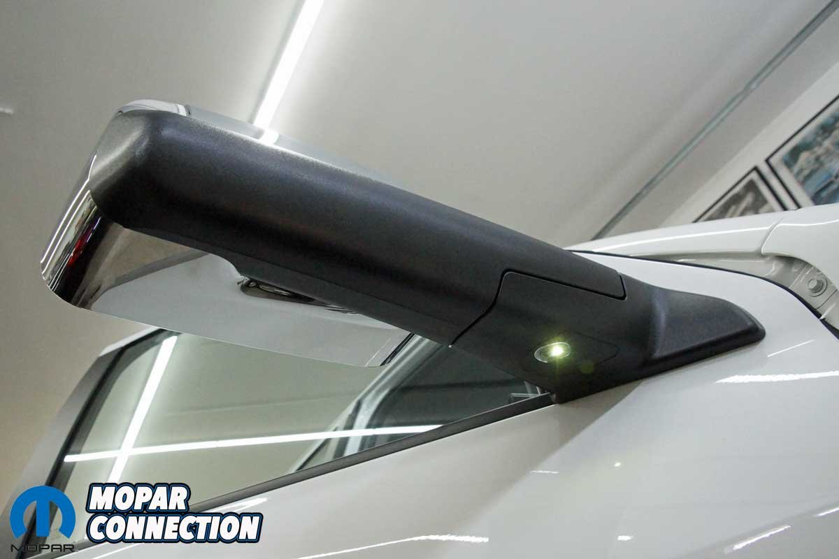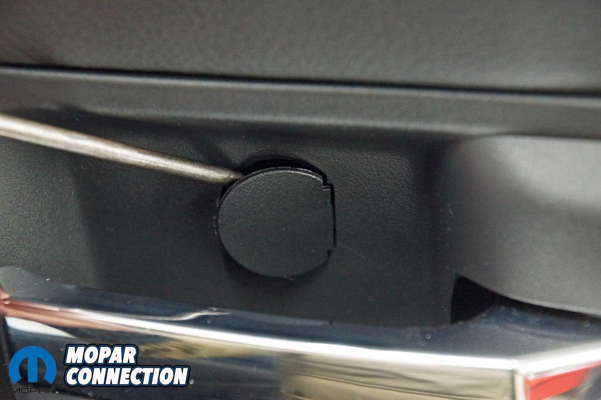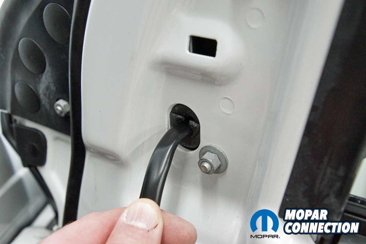 The installation of the mirrors required hand tools and some finesse. Starting with the passenger side door, we removed the mirror flag (Mopar term) from the door with a plastic removal tool, which exposed all three mirror support fasteners. Although the fasteners were visible, the harness connectors were snapped in place deep under the door panel.