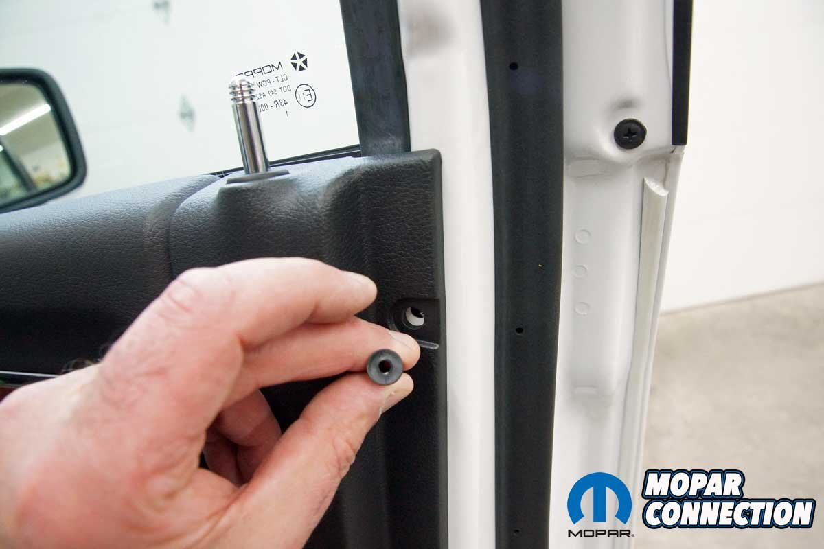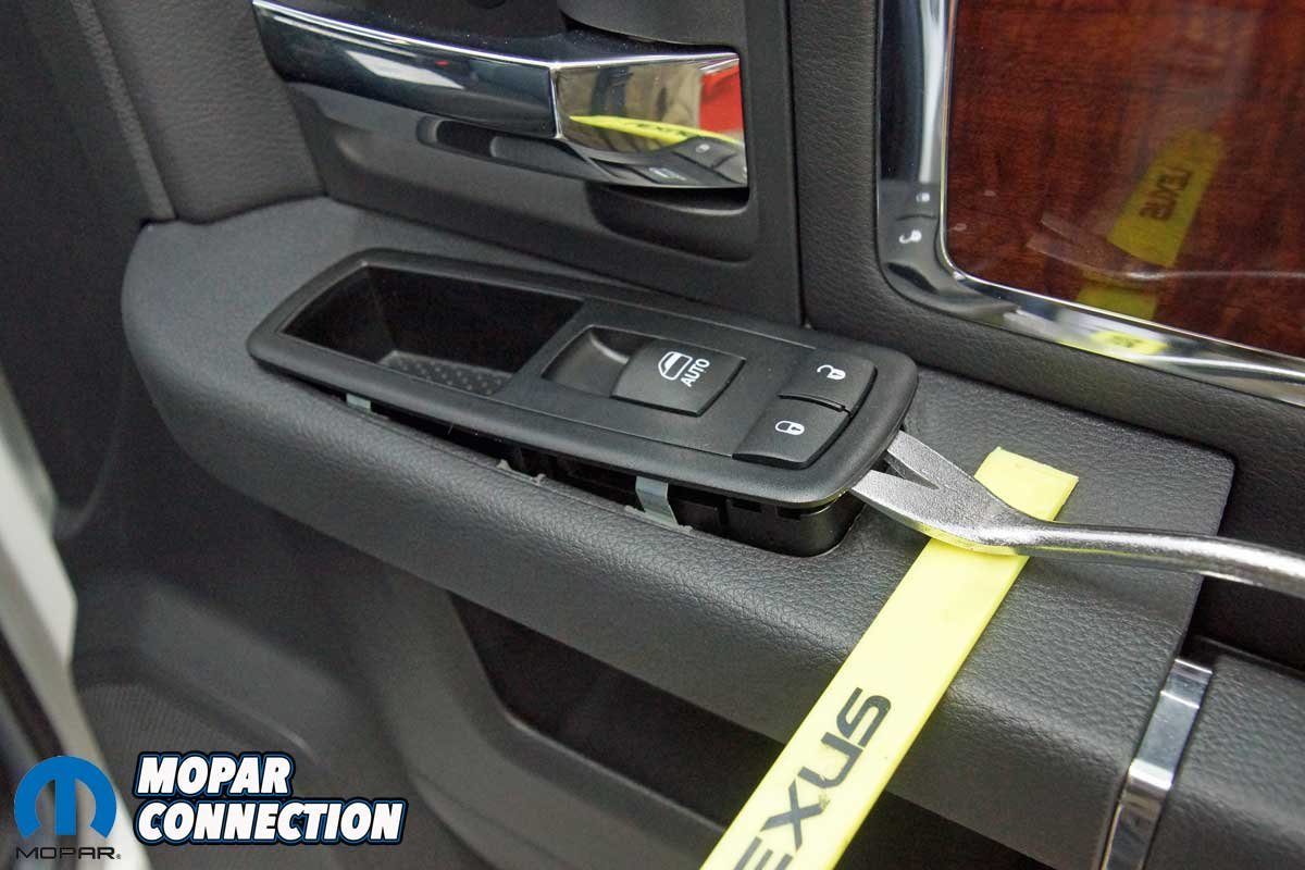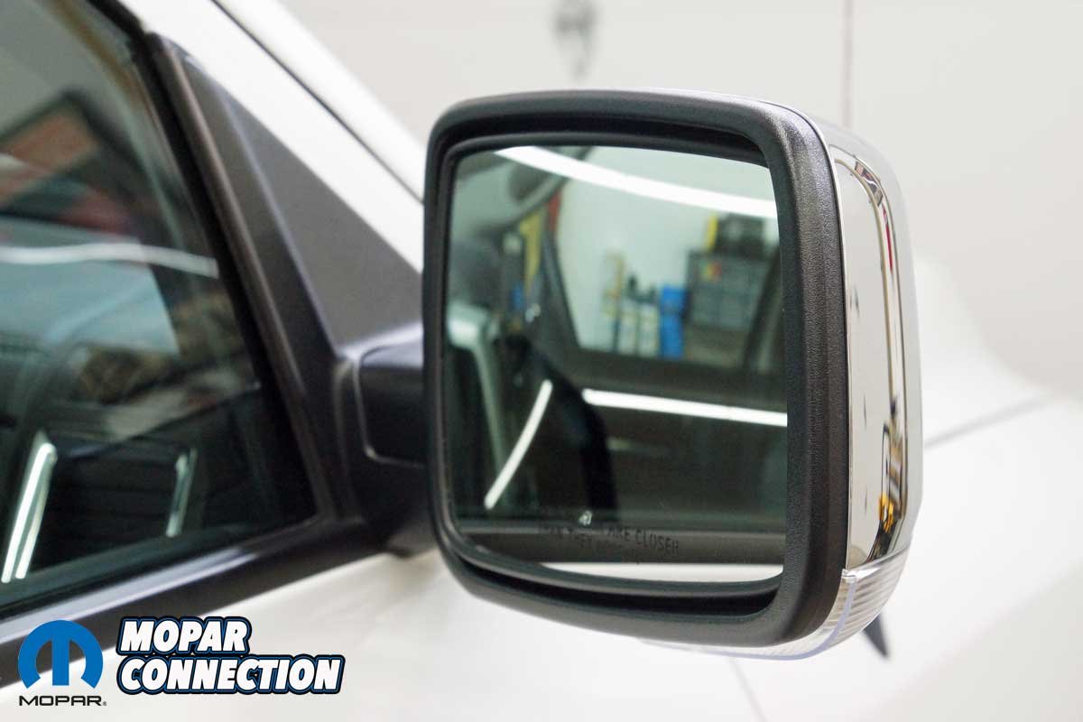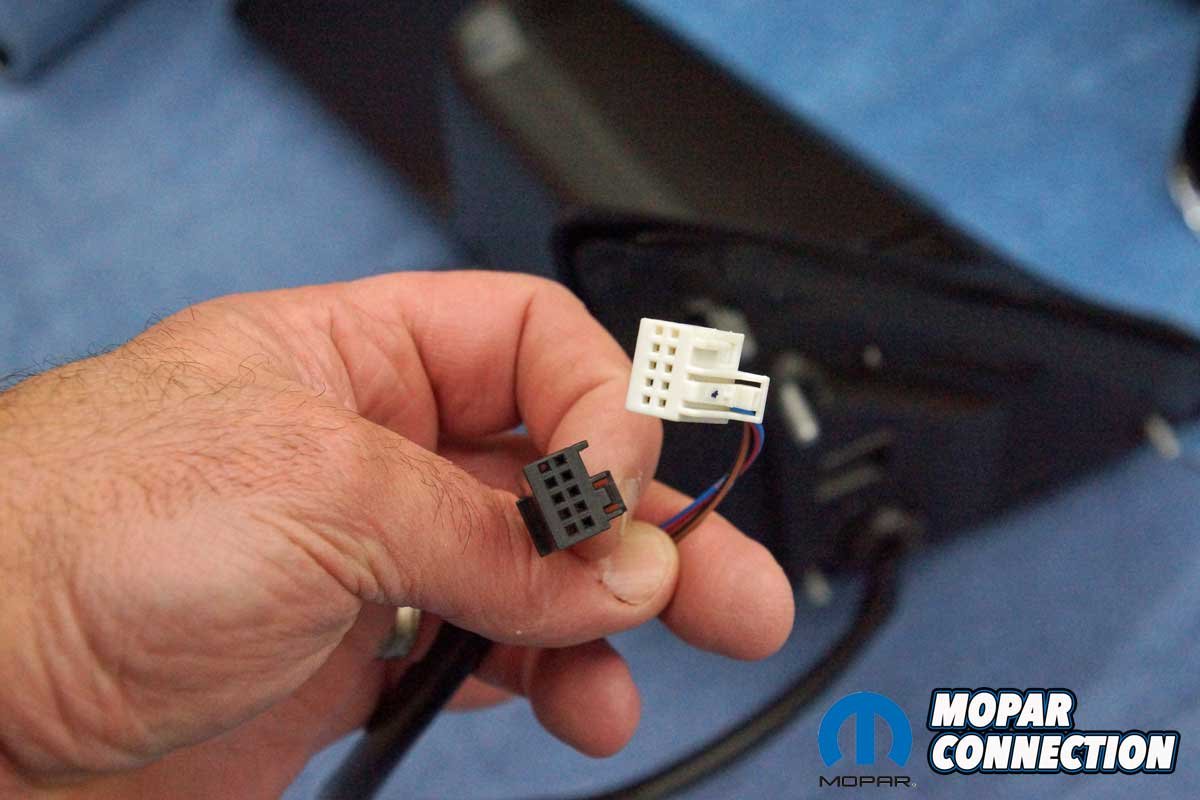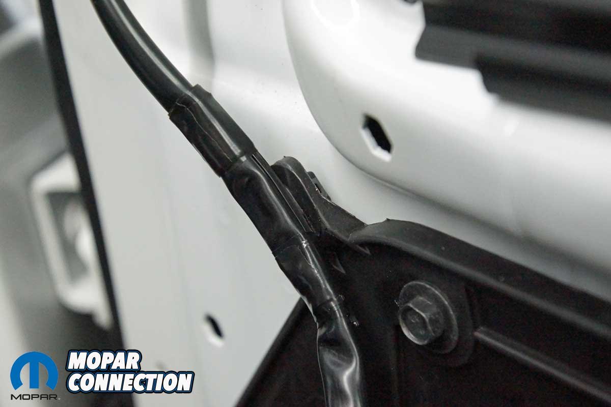 The installation of the mirrors required hand tools and some finesse. Starting with the passenger side door, we removed the mirror flag (Mopar term) from the door with a plastic removal tool, which exposed all three mirror support fasteners. Although the fasteners were visible, the harness connectors were snapped in place deep under the door panel.