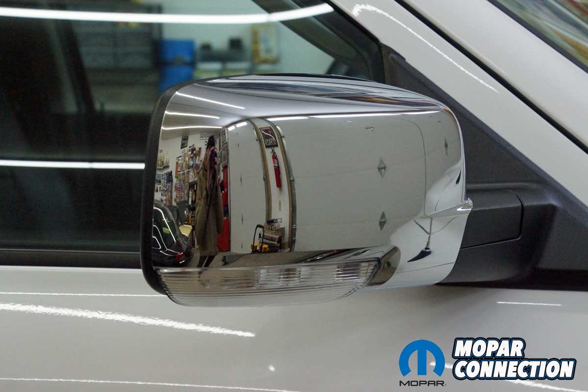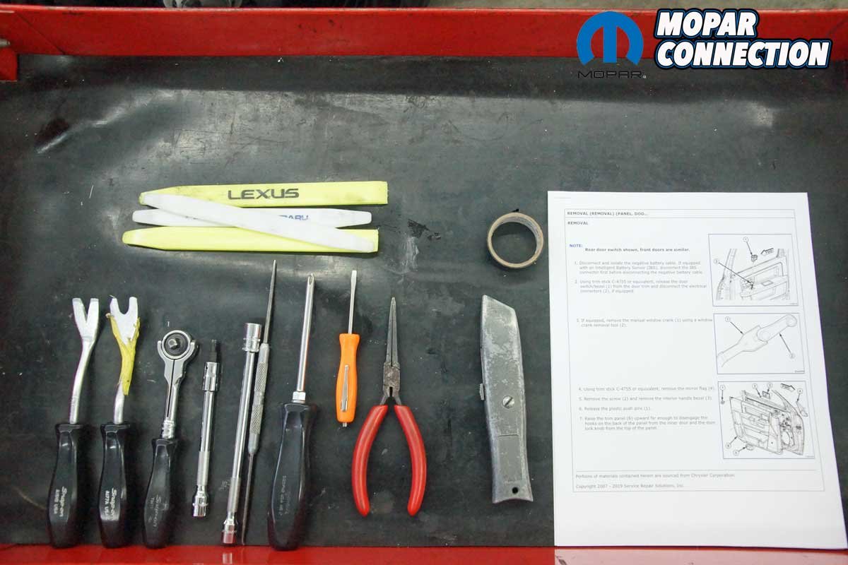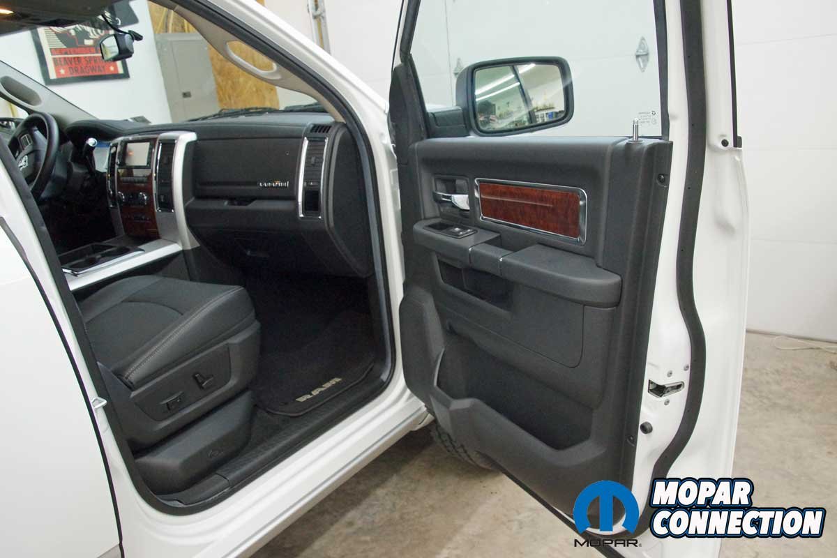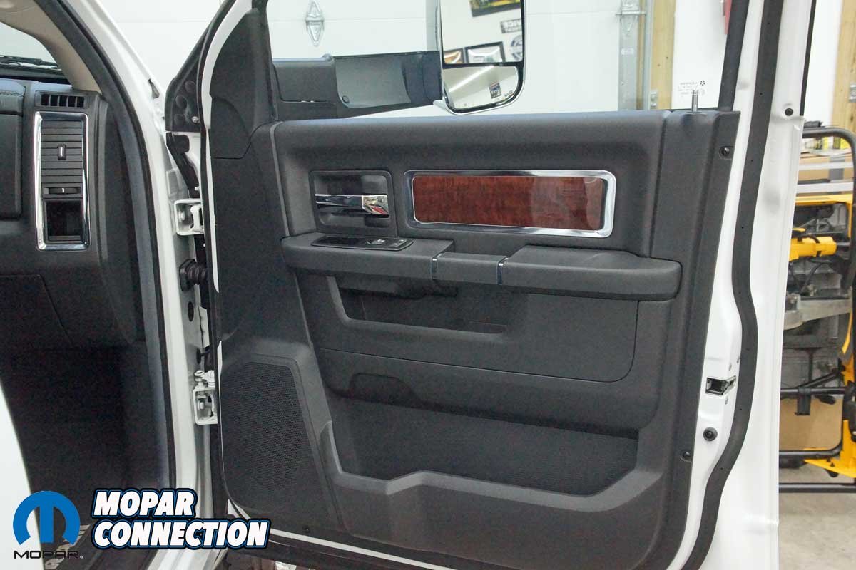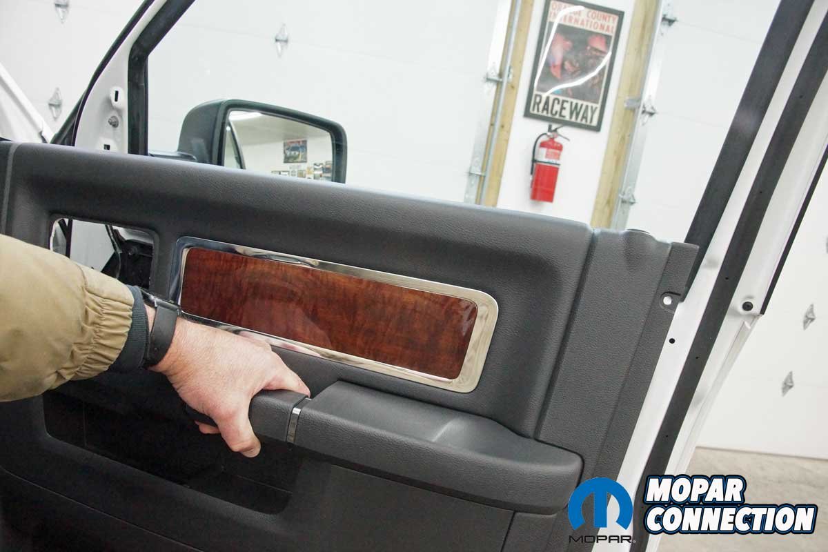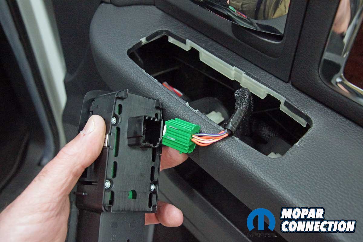 The installation of the mirrors required hand tools and some finesse. Starting with the passenger side door, we removed the mirror flag (Mopar term) from the door with a plastic removal tool, which exposed all three mirror support fasteners. Although the fasteners were visible, the harness connectors were snapped in place deep under the door panel.