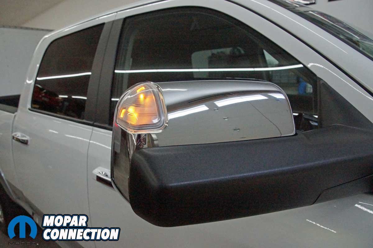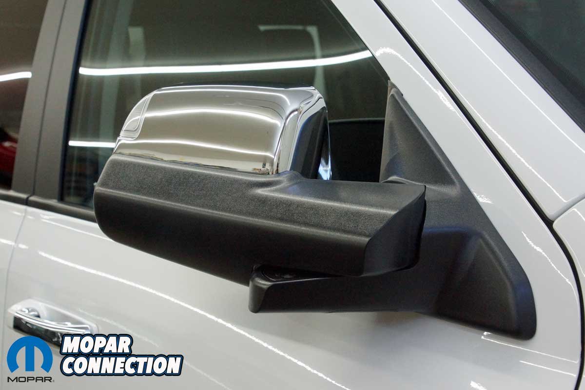 With the mirrors in the normal position (down), the Ram looks nearly stock. The chrome cap on the mirror is so similar to the factory units most people will not even notice that the mirrors are aftermarket pieces. The mirrors provide an excellent rear view without the trailer attached.