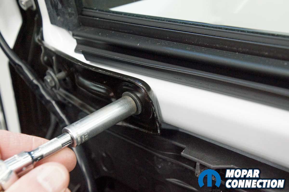 Above: After tightening all three plate bolts, the two mirror bolts removed for the plate installation were reinstalled and torqued to spec. The plate fits perfectly under the door panel, and the wiring harness clears the plate as well.