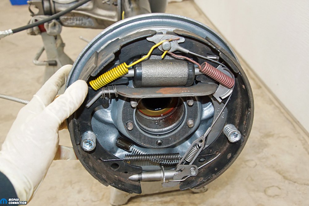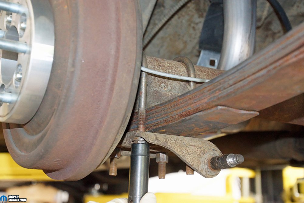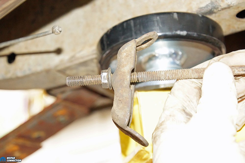 Above Left: To remove the 7 ¼ rear end, we needed to pull the shocks from the shock plate. The U-bolts had to be loosened and removed from the housing. Once the U-bolts were removed, only gravity held the rear end in place. Above Right: We planned on reusing the front half of the parking brake cable, but each rear cable was replaced. We backed off the adjuster nut, which allowed us to slip each rear parking cable from the equalizer. We also removed the equalizer so that we could use a new one with the new parking brake cables.