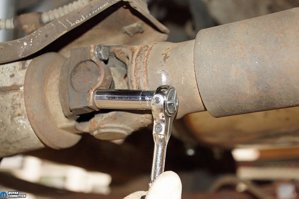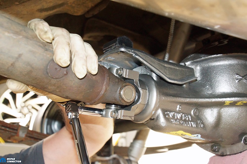 Above Left: The pinion-yoke straps were torqued to specification. We needed the U-joints to be correctly seated and the straps in place. With the U-joints seated, we could use our inclinometer on the U-joint caps to attain an accurate measurement. Above Right: With the 8 ¾ installed, we placed jack stands under the rear end to bring the rear suspension back to trim (standard) ride height. Another jack stand was placed under the front bumper to ensure the Dart would not fall off the lift.