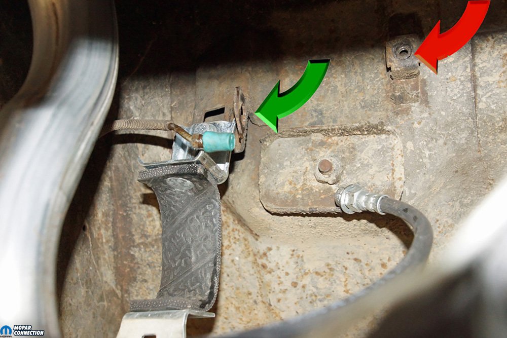 Above Left: The driveshaft U-joint was released from the pinion yoke. Usually, we would mark the driveshaft and the pinion yoke so that we could realign the driveshaft and yoke during reassembly, but because we were not reusing the parts, we did not mark them. Above Right: The brake line had to be disconnected from the brake hose. The brake line was capped with a rubber plug, and the brake hose clip was removed, allowing the brake hose to slip out of the tab (green arrow). The passenger-side cable retention clip had already been removed (red arrow).