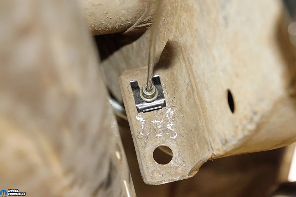 Above Left: The larger 3-inch U-bolts were slipped over the axle housing and into the 8 ¾ shock plates. We still had to make our driveshaft working angle measurements, so we snugged the U-bolt nuts. Above Right: The parking brake cable was routed to and pushed through the factory tab on the chassis. Once the parking cable was seated, we installed the new clip. The driver-side parking brake cable was connected similarly.