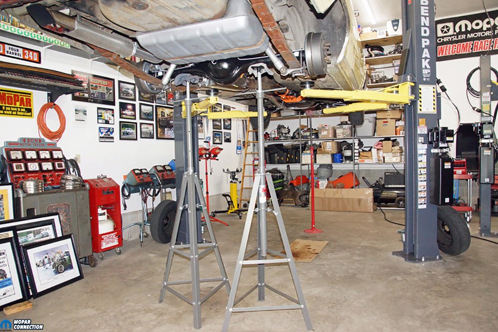 Above Left: Pardon the mess. The top driveshaft is the factory 904/7 ¼ unit, and the shorter driveshaft is a 904/8 ¾ piece. Both are factory driveshafts. The 8 ¾ driveshaft had been high-speed balanced before its installation. Above Right: We placed the 8 ¾ on jack stands under the Dart. The Dart was lowered down so we could reattach the leaf spring shackles to the chassis. Once the leaf springs were in place, we lined up the spring perches with the leaf spring alignment pins.