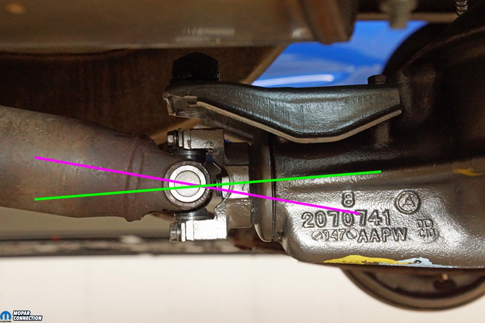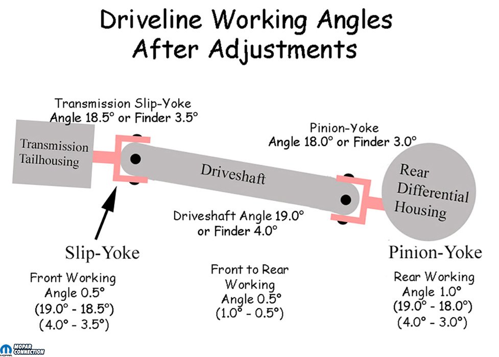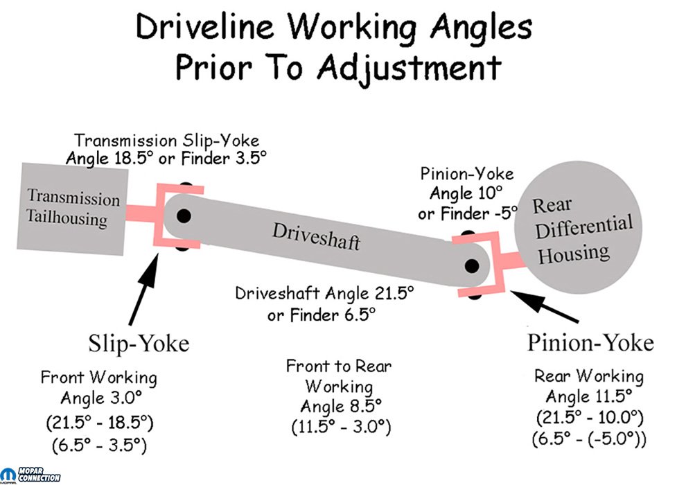 The measurement of the transmission slip-yoke was 18.5° for a front working angle of 3° (driveshaft weld-yoke 21.5° minus slip-yoke 18.5°). The measurement of the pinion-yoke was a jaw-dropping 10°, for a rear working angle of 11.5° (driveshaft weld-yoke 21.5° minus pinion-yoke 10°). It should be noted that the front and rear working angles should be nearly equal but opposite. By subtracting one working angle from the other, the difference between the front and rear working angles should not exceed 0.5° (0° is perfect). Our front-to-rear working angle was 8.5° (rear working angle 11.5° minus front working angle 3.0°).