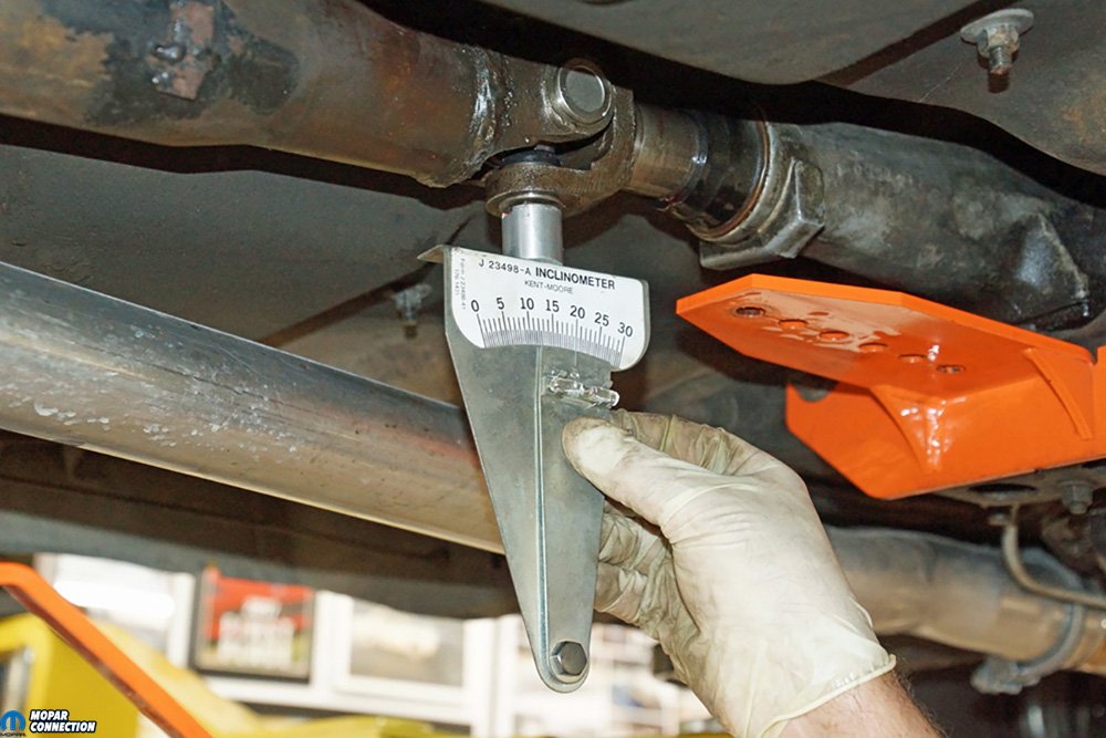 With most of the vibration concerns eliminated, we used an inclinometer to measure the yoke alignment or working angles of the driveshaft. With the rear axle supported on jack stands, we used the inclinometer to make our measurements. We measured the driveshaft for twisting, and there was none. The driveshaft weld-yoke angle at the rear U-joint was 21.5°, and the driveshaft weld-yoke angle at the front U-joint was 21.5°. If the difference between the front and rear U-joint had been greater than 0.5°, this may have indicated a bent or damaged pinion-yoke, which would require repair or replacement.