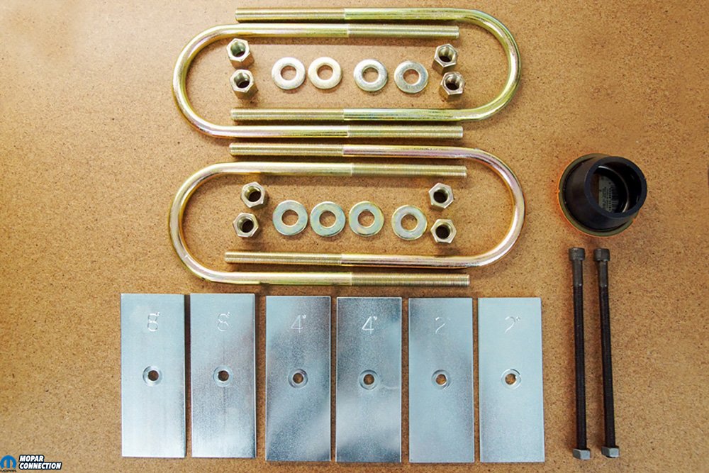 We found WFO Concepts offered 4WD leaf spring alignment pins with bolts that slipped through each shim and each leaf of the leaf springs. They also advertised shims, so we picked up a pair of 8° shims. After clamping the leaf spring together with c-clamps, we removed the factory pin bolt and installed the new shims and the new alignment pin bolt. The shims we selected should have placed the pinion-yoke angle somewhere around 3°, but the shims are never perfect, and it becomes a trial and error process to establish the proper shims necessary. With the shims installed (narrow end of the wedge facing rearward), the U-bolts were reinstalled and torqued to specifications.