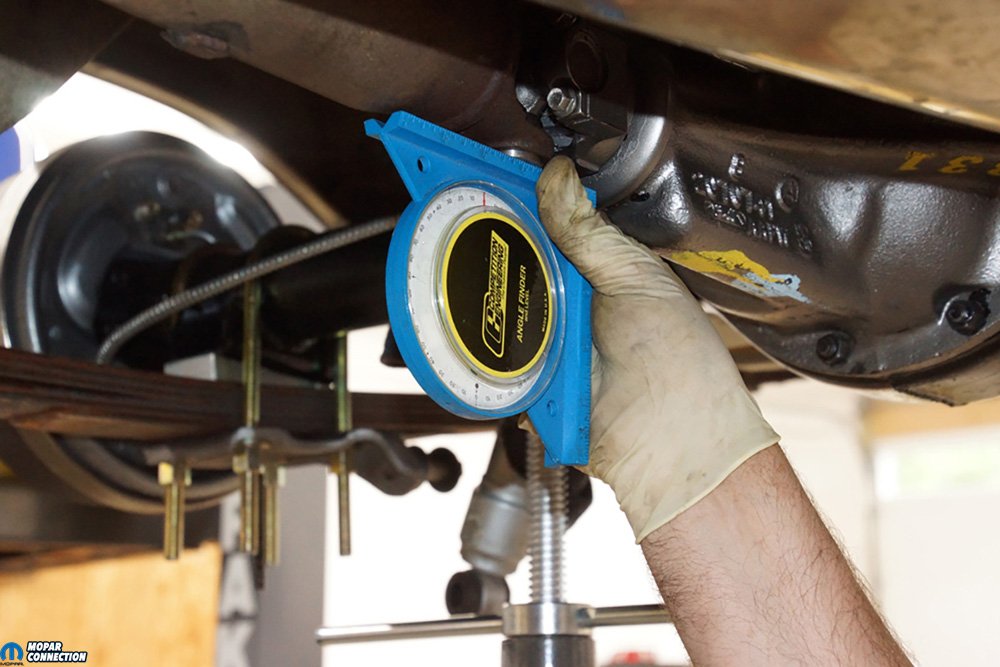 While we waited for our YearOne parts to arrive, we examined the housing more closely. We positioned each spring perch on a jack stand, and an angle finder was placed on the surface where the center section bolts to the housing. The angle was just as we had been told: 3° down (pointing toward the floor). This angle was the cause of the vibration dilemma the previous owner had experienced. The center section angle should point upward but at a lesser angle when compared to the driveshaft.