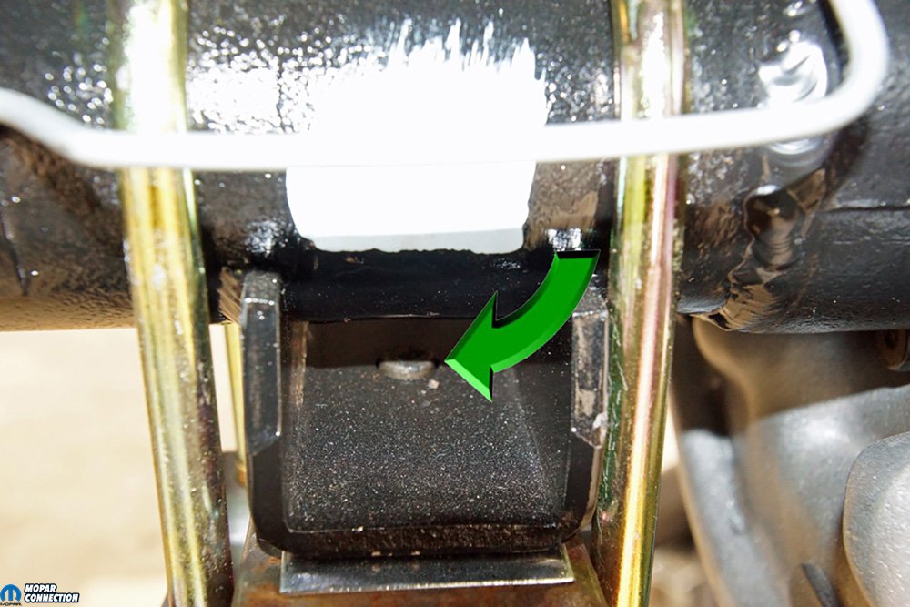 Above Left: If an inclinometer had not been available, an angle finder would provide the same working angle information. However, the inclinometer measures 0° to 30° with 15° being the centerline (0° on an angle finder). An inclinometer will provide all positive numbers, so the mathematics to figure the working angles is more natural. An angle finder can have a mixture of positive and negative numbers, which can be confusing when the angles are out of spec. Above Center: The WFO Concepts alignment pin can be seen protruding through the spring perch (green arrow). The proper engagement provided us with confidence that the rear end would remain properly located while we traverse the Pennsylvania countryside. Above Right: After the rear end’s working angles were established, we realigned the Dart to ensure the thrust angle was in spec. We had to shim the passenger-side leaf spring hanger to bring the thrust angle into place. We used Hotchkis shims to perform this adjustment.