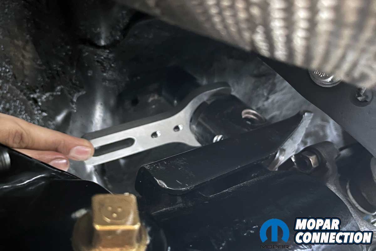 Above Left: To minimize the axle wrap, we picked up a pinion snubber. As the axle moves upward under hard acceleration, the snubber, which is attached to the axle housing at the pinion, will hit the floor, thus stopping the upward motion. Above Right: Because of the limited space to adjust the jamb nut, WAF Racing designed and adjustable pinion snubber wrench.