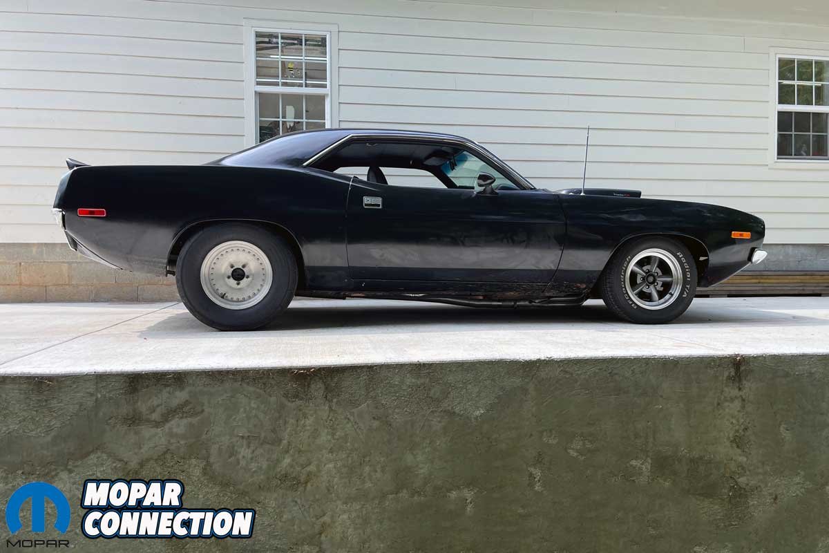 Above Left: Many people assume the rear end of a Mopar will sit high with Super Stock springs. Our ’73 ‘Cuda has just the right altitude (attitude) with a pair of 3200lb springs and a 28-inch-tall tire. Above Right: Our big Newport sporting a 512-cube big block can get air under the front tire. That is quite a feat for the two-ton C-Body, but the Super Stock springs (custom-made copy that emulates the SS springs) make all the difference. The Newport’s 60-foot times are in the 1.65 second range.