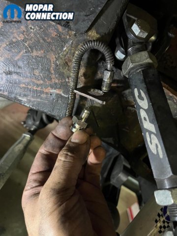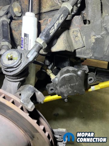 Disconnect the flexible brake line from the hard line at the frame rail using a 3/8” line wrench and a flathead screwdriver and pick to remove the clip holding it in place. The caliper can now be removed set aside. Cap the lines to avoid a a dripping mess while working through the swap.