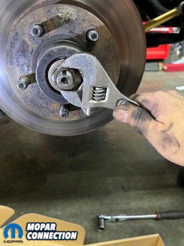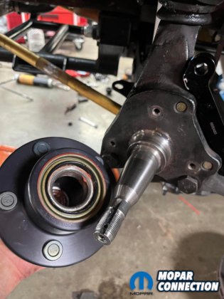 Install the new billet aluminum hub next. The new bearings are pre-packed with synthetic grease so additional greasing is not required. You should apply a small amount of grease to the hub seal surface before sliding the hub on so everything seats smoothly without sticking. Per Baer they advise to install the spindle nut and tighten the nut to 5-10 ft·lbs and spin the hub to seat the bearings.