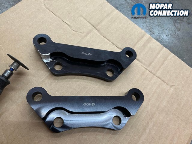 Above: Minor modification to the Baer caliper mounting bracket (left bracket modified, right bracket unmodified)