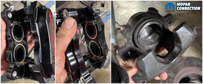 Above: Comparison of the Baer 4-piston calipers to the factory caliper