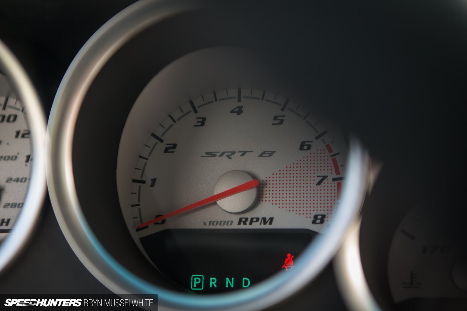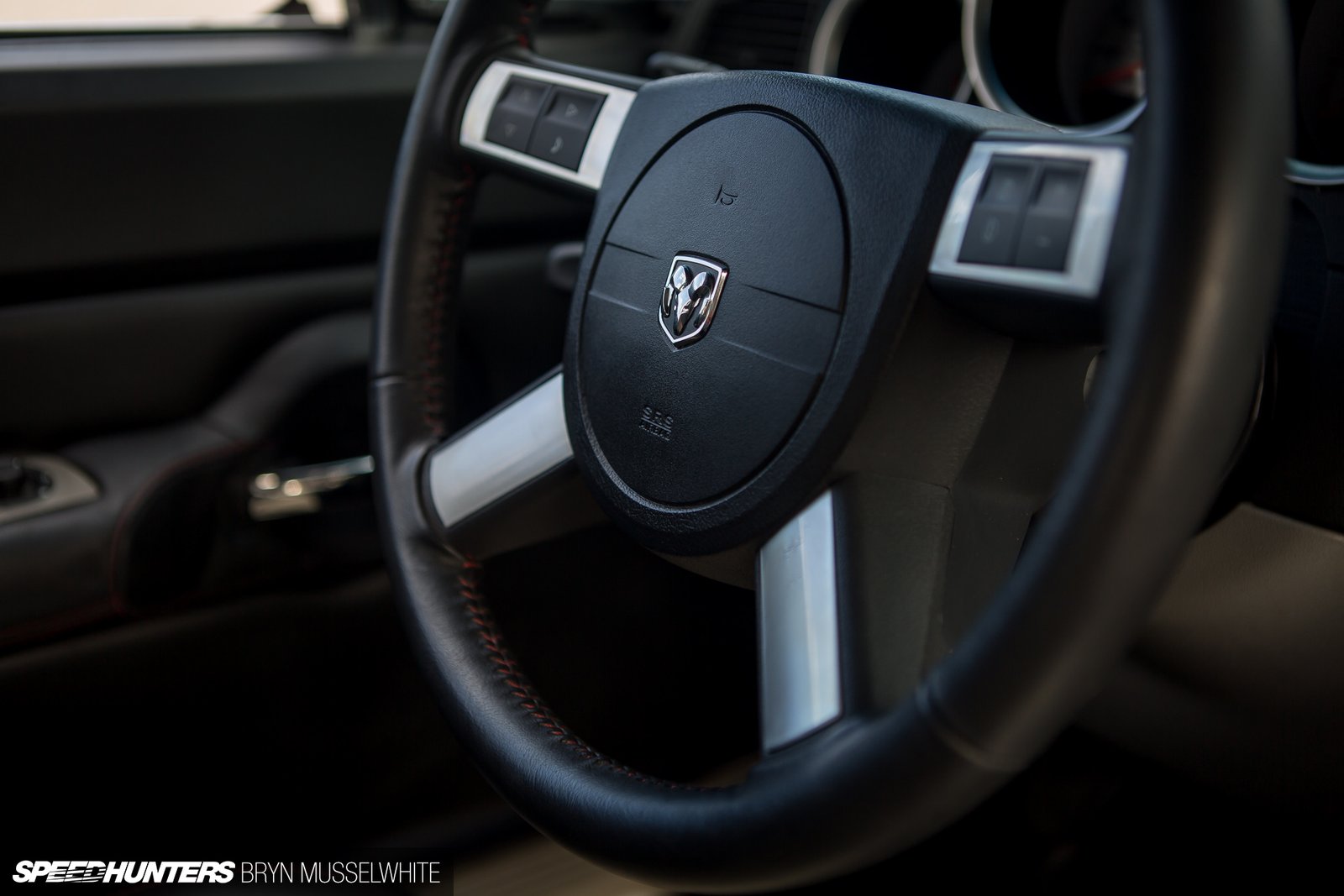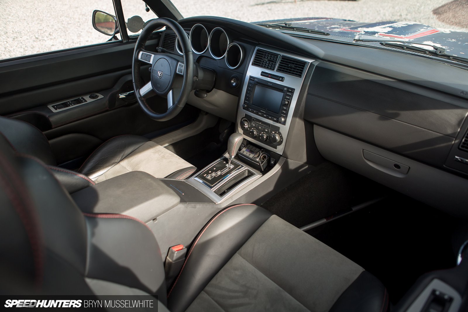 If life has taught us anything though, it’s to not judge a book by it’s cover. Take a closer look. You may notice the black 22-inch American Racing Torq-Thurst wheels. Take a another look. Wait, why does it have big Brembo brakes and SRT8 badging? Why does it have HEMI badges? Are those ‘Cuda styled billboard graphics? Those say HEMI too! Confused yet?