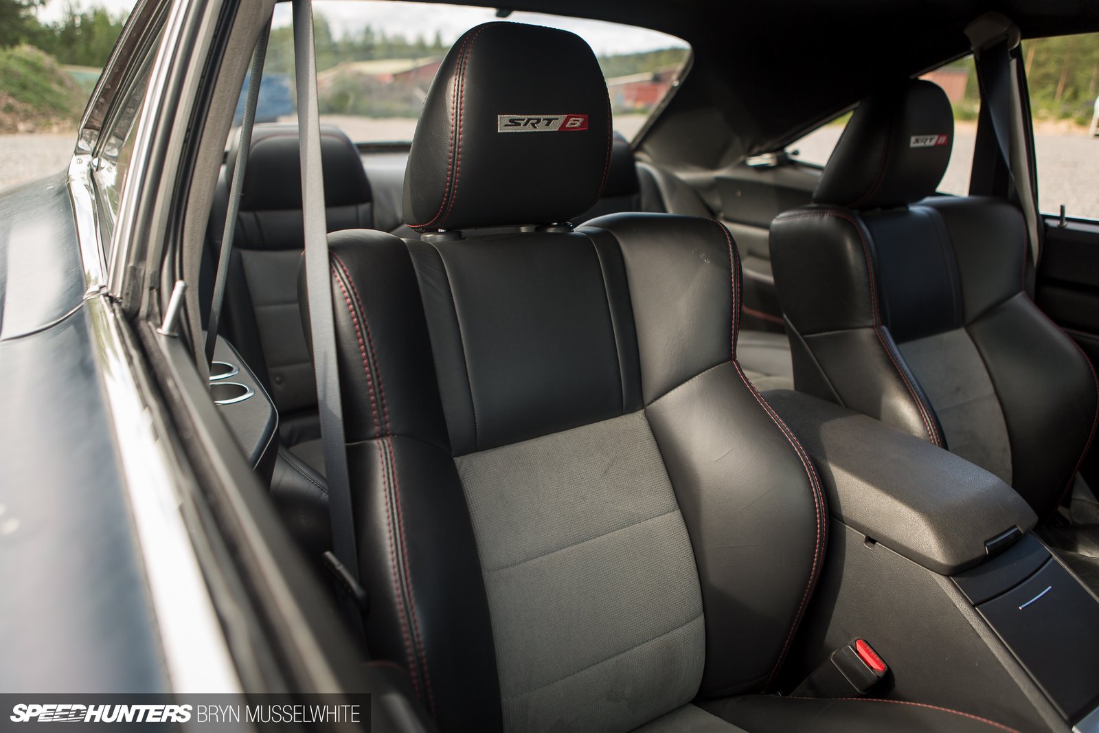 The interior is mostly all factory SRT gear. High bolstered full lumbar support leather and suede SRT seats hug the driver and passengers well for those tight corners all while allowing you to go on a multi-hour road trip without getting sore! The interior door panels and rear package tray were custom designed and built for the car, perfectly matching the SRT interior while fitting the original Coronet door shell. The rest of the interior remains original from the SRT Charger.