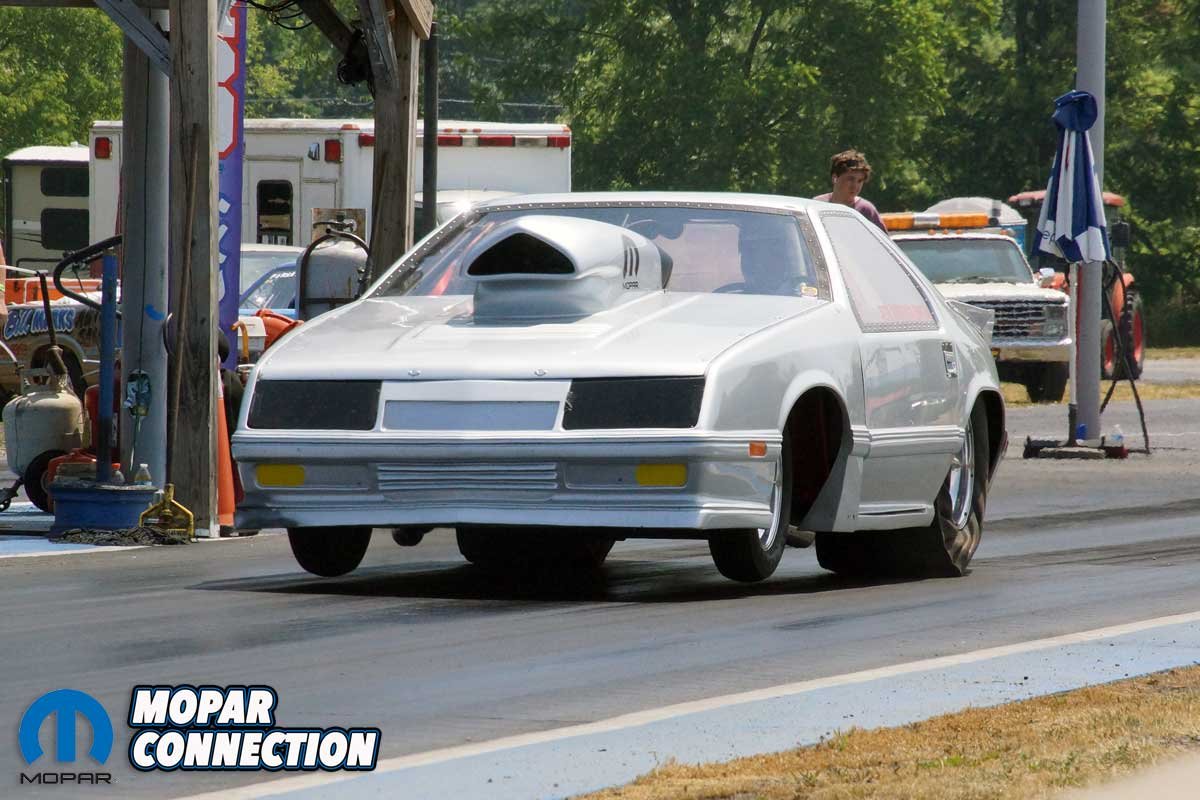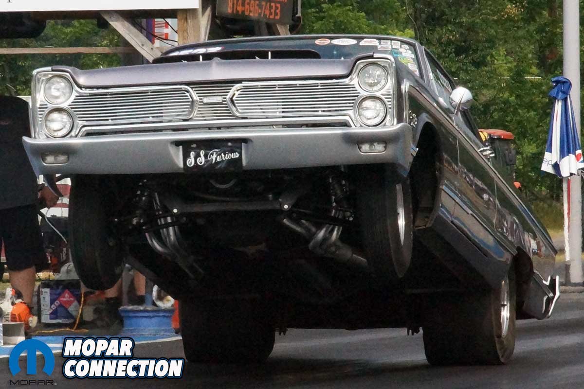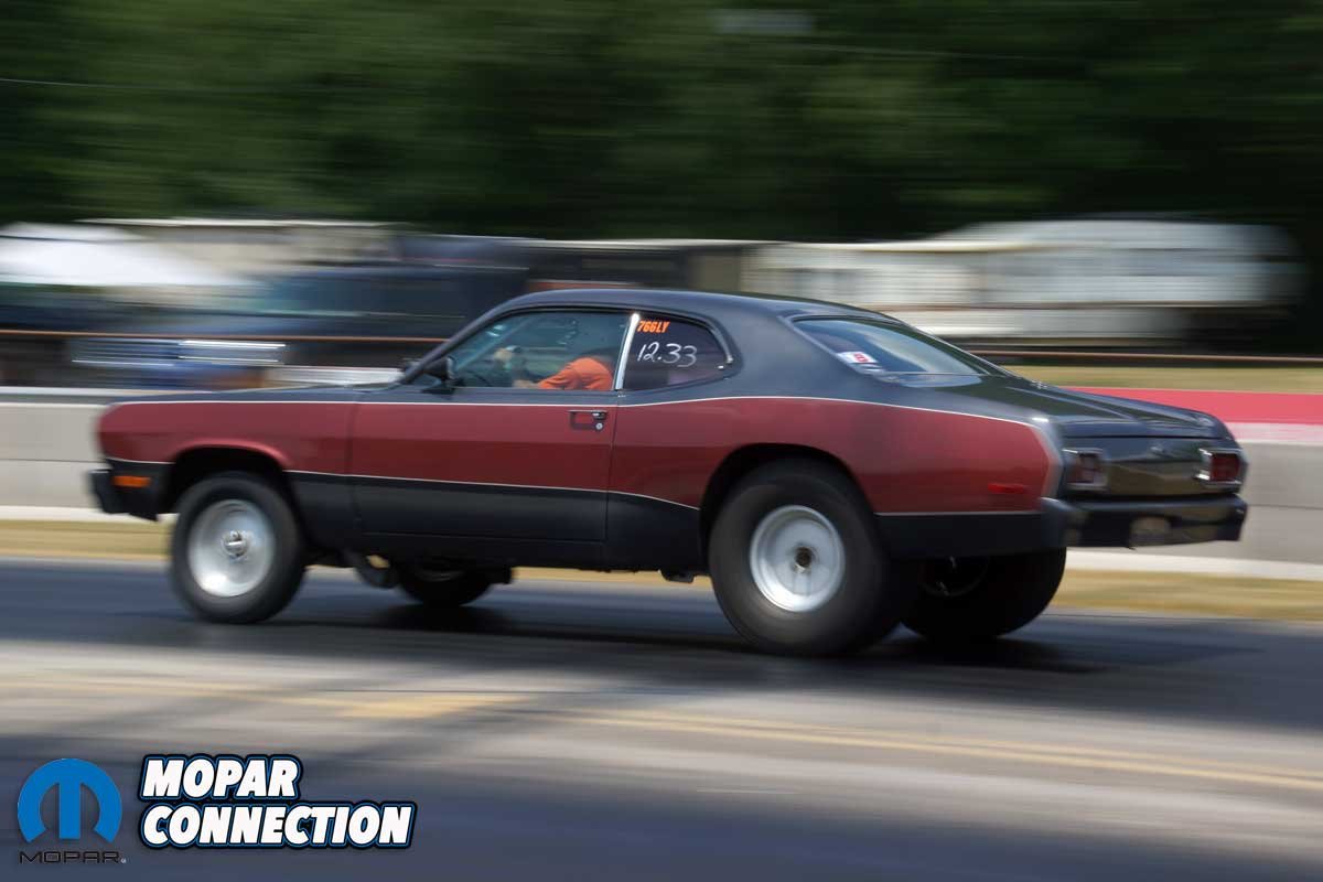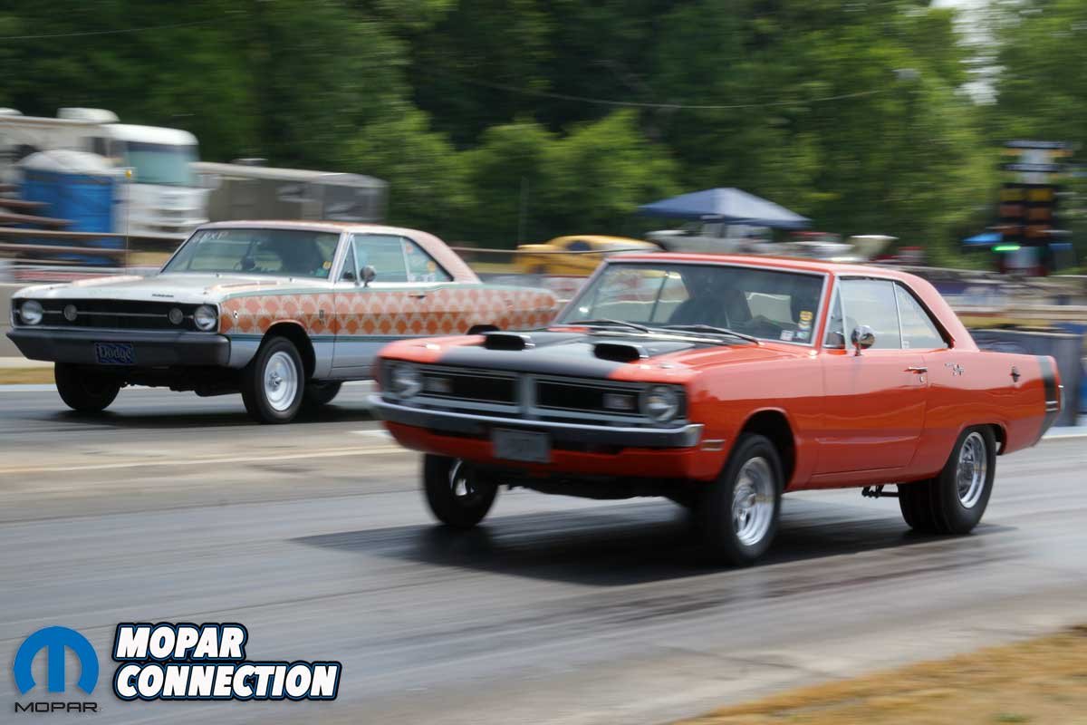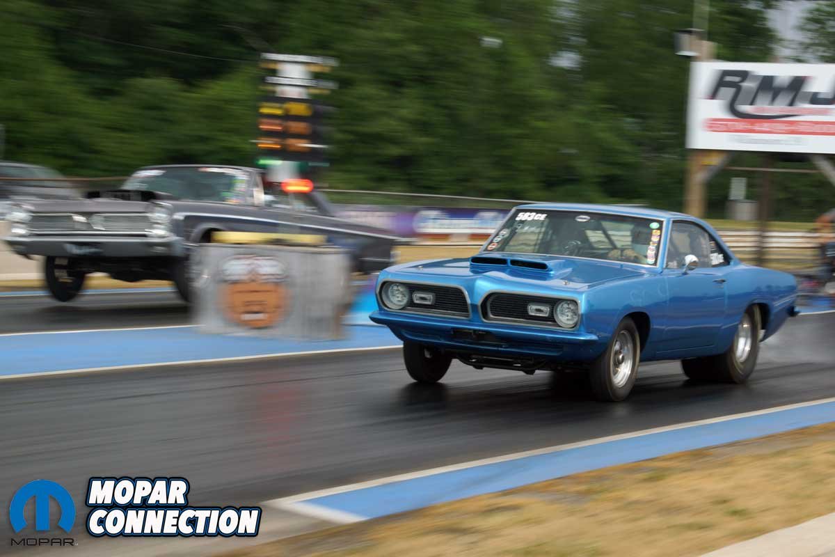 For the last few years, all the drag cars have been divided among four classes. The quickest eight Mopars on the grounds run in the Pro Mopar class. The eliminator operates off a .400 pro tree and is the only class to compete in the 1/8th mile. The other three eliminators run the ¼-mile and leave the starting line using a .500 full tree. Mopars running quicker than 11.99 seconds in the ¼-mile compete in HiPo Mopar. A 12-second or slower Mopar participates in Cool Mopar. Lastly, the late-model Mopars race the Modern Muscle class.