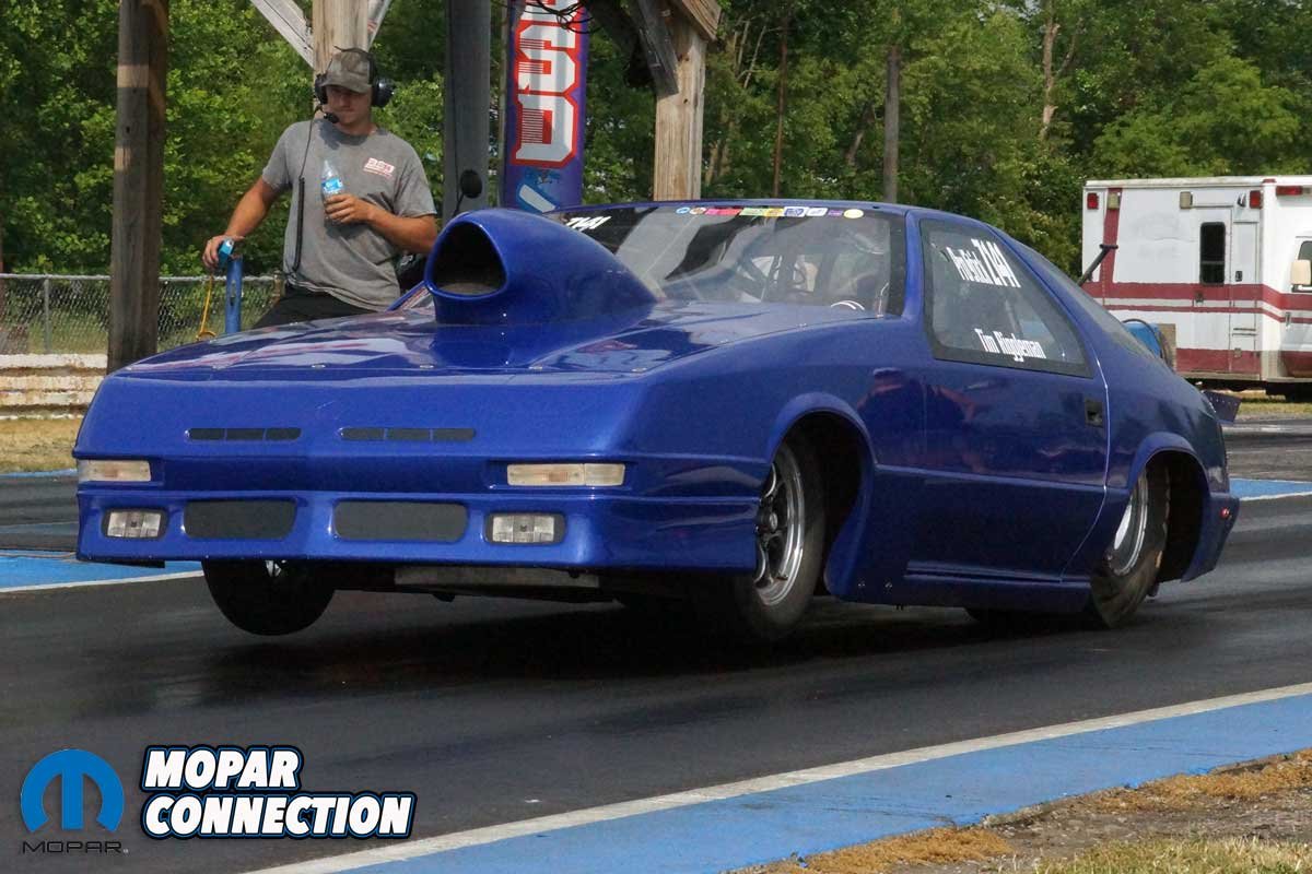 In his 1991 Dodge Daytona, Tim Riggleman anchored the Pro Class field with a 7.882 at 173 mph (5.04 in the 1/8th). After running a 5.054 in round one and a 5.049 in round two, Riggleman lined up against number two qualifier Huston Richards in his 1968 turbocharged Dodge Dart. At the flash of the tree, Riggleman had a great reaction, while Richards was a little tardy. Riggleman clicked off a 5.052 at 136.61 mph to take the win.