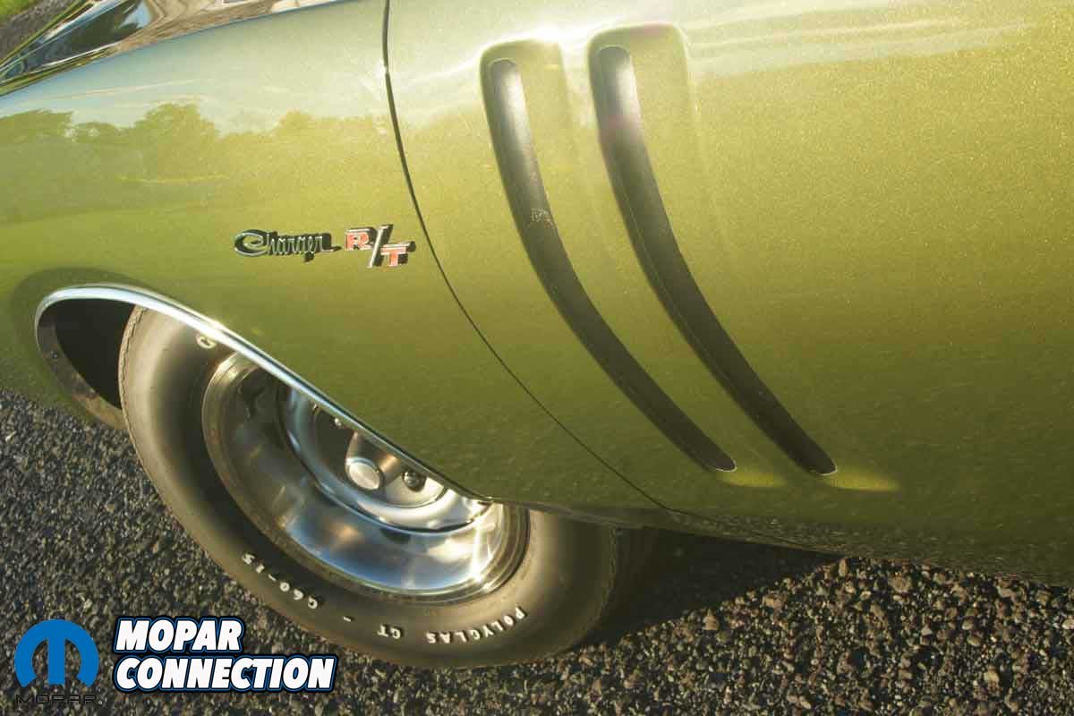 Due to the build date of the Charger (September 1970), the steel wheels would have been body color. Not until May 1, 1971, did Chrysler decree that all steel wheels must be painted black rather than body color. Owen then confided to Bill that the wheels were still in the garage. Although Bill has retrieved the wheels, he prefers the 15-inch Rallye wheels.