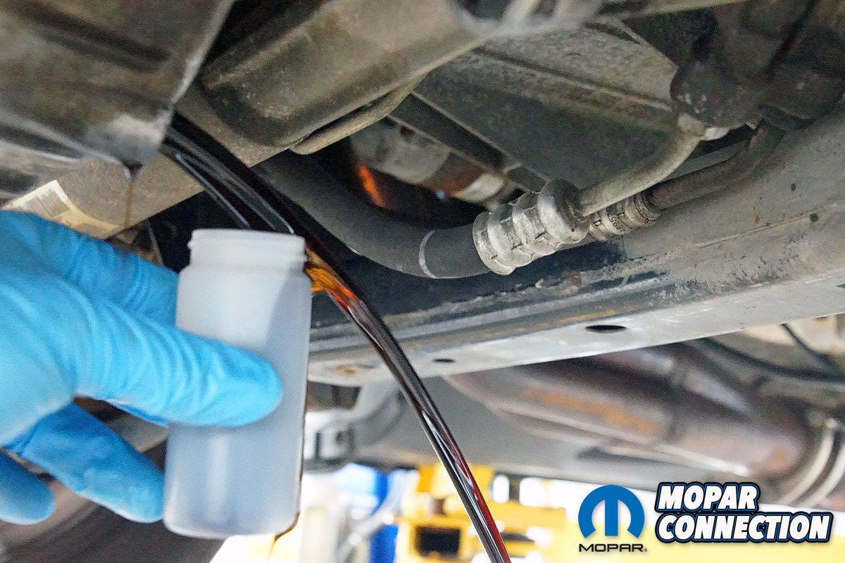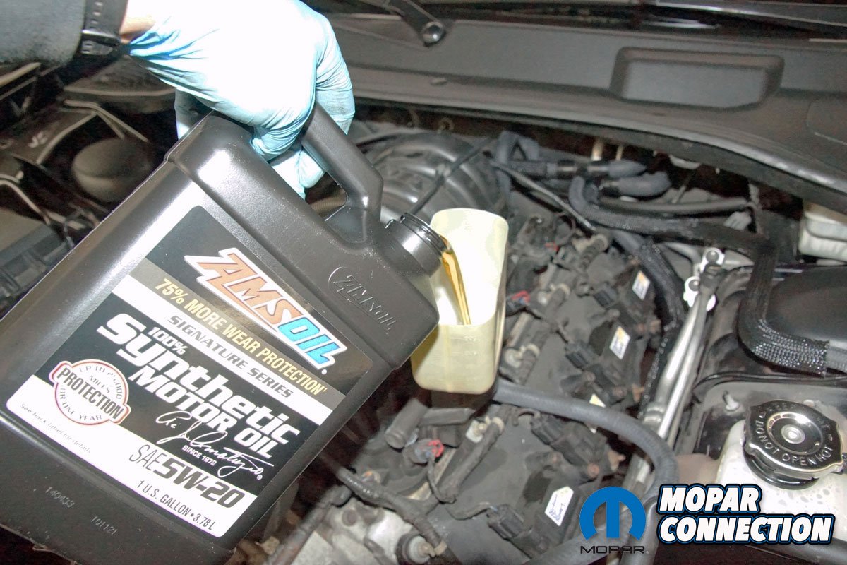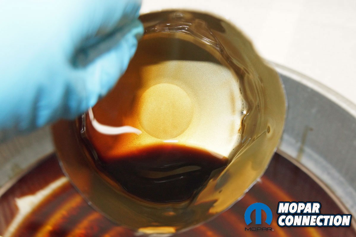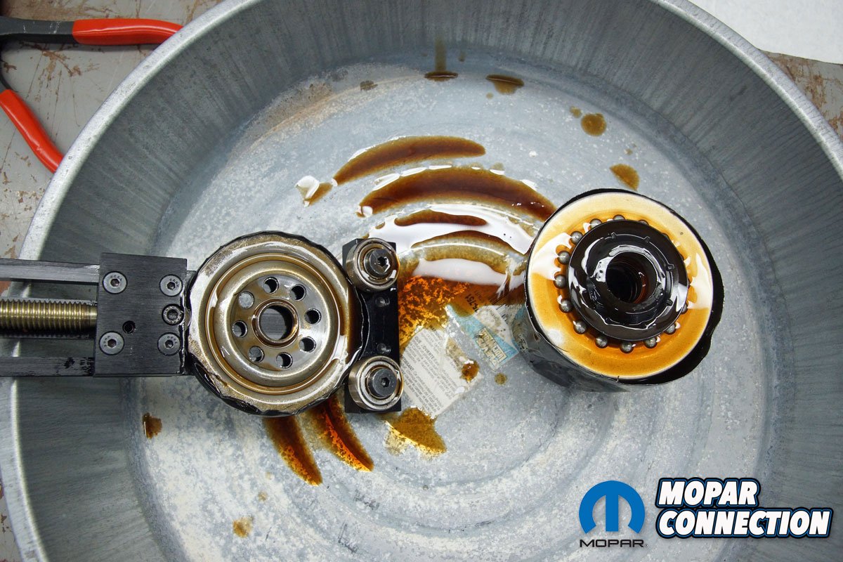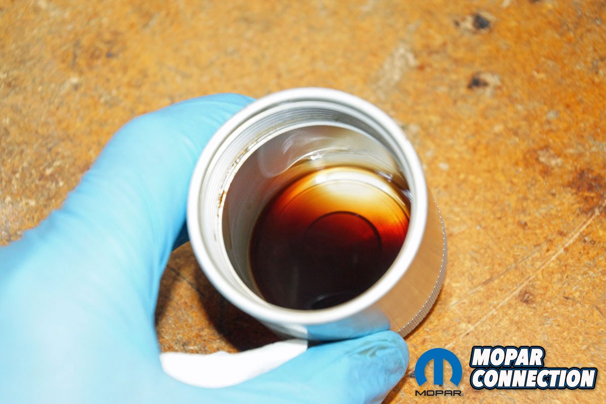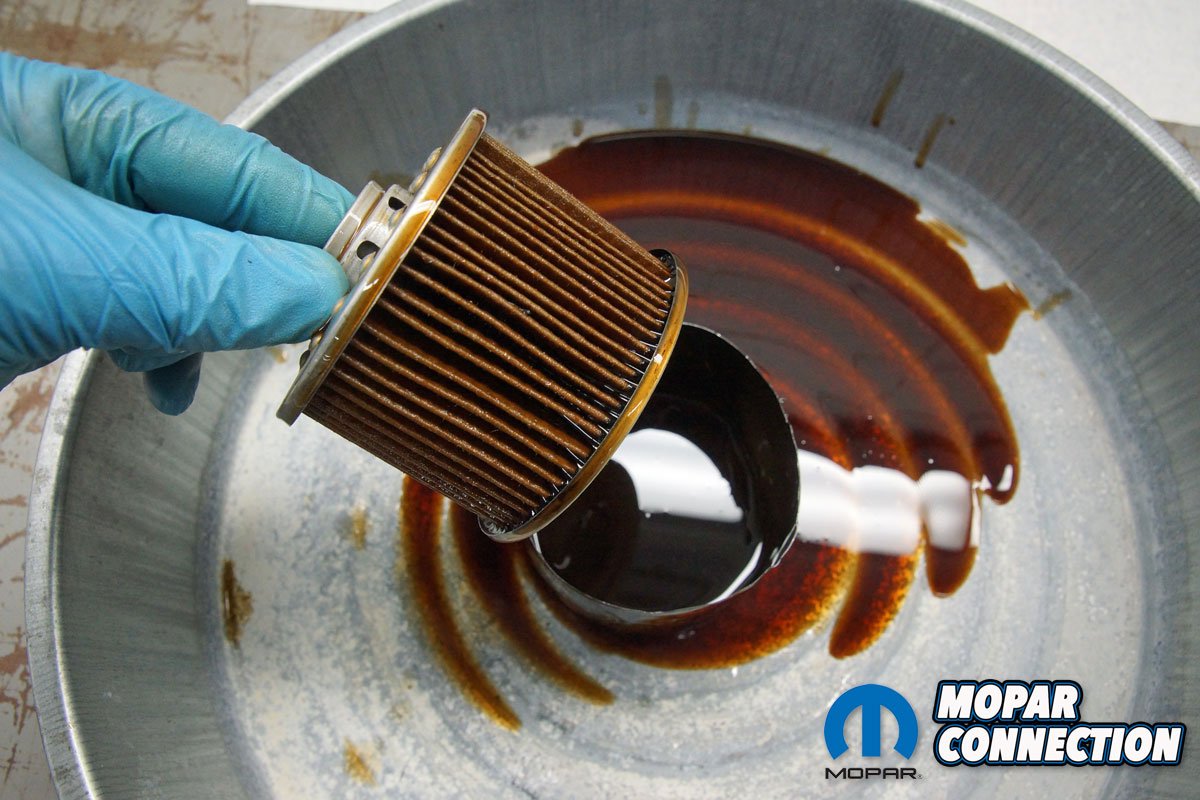 Above Left: With the engine up to temperature, we captured about 3-ounces of oil into the collection container. Above Right: If the factory filter was good enough for the manufacturer, it is good enough for us. Since we have owned the Charger, Mopar filters have worked well for us.