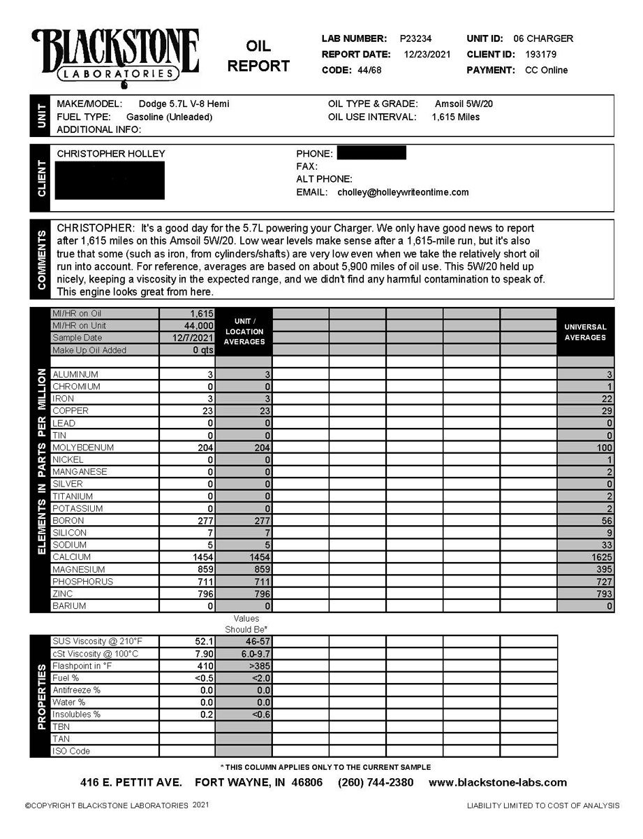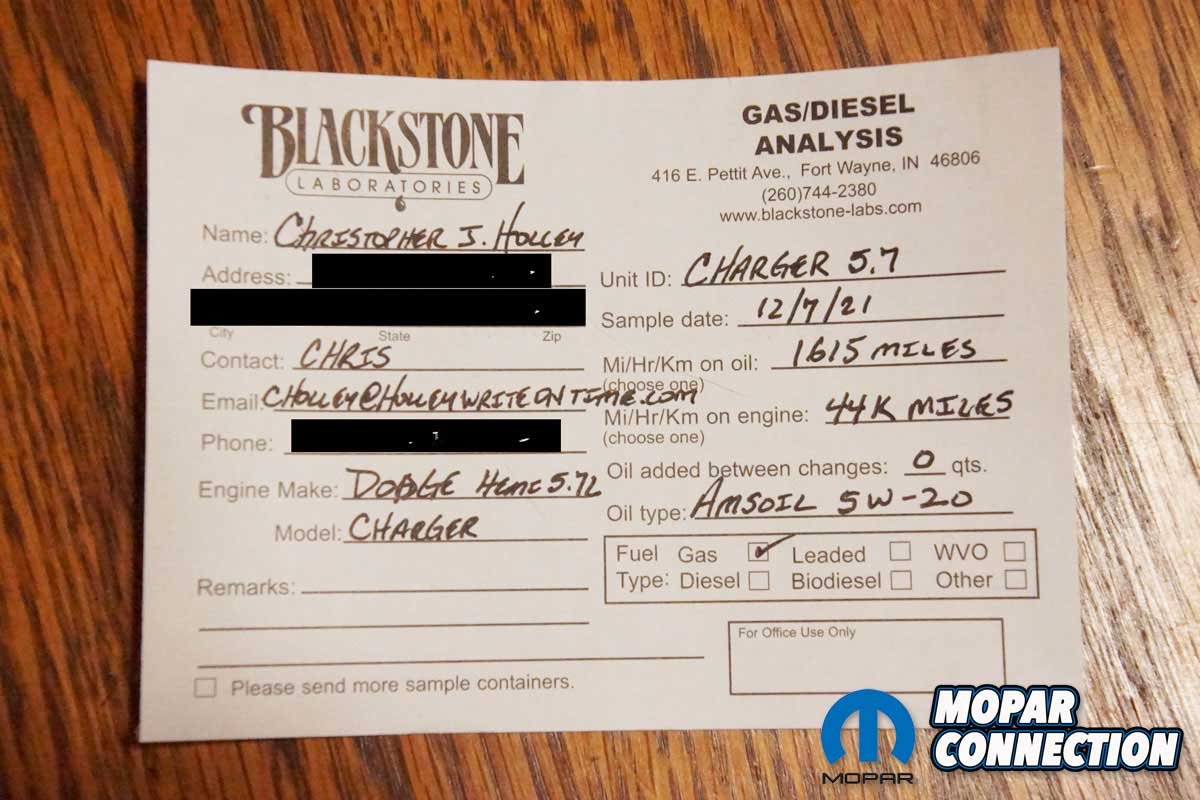 The entire process with Blackstone Laboratories was an excellent experience. We received the sample product collection components quickly, the gathering and mail-in procedure was easy to perform, and the results were easily understood and provided in a timely fashion. If there is a concern about your Hemi or any other engine, a professional lab analysis is an excellent way to ease any apprehensions about your engine’s condition.