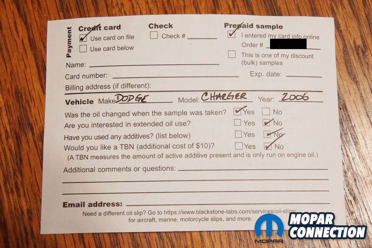 Because an extended trip was planned for the Charger, we contacted Blackstone Laboratories for a free oil analysis test kit to complement our regular oil filter inspection and offer peace of mind about any engine concerns.