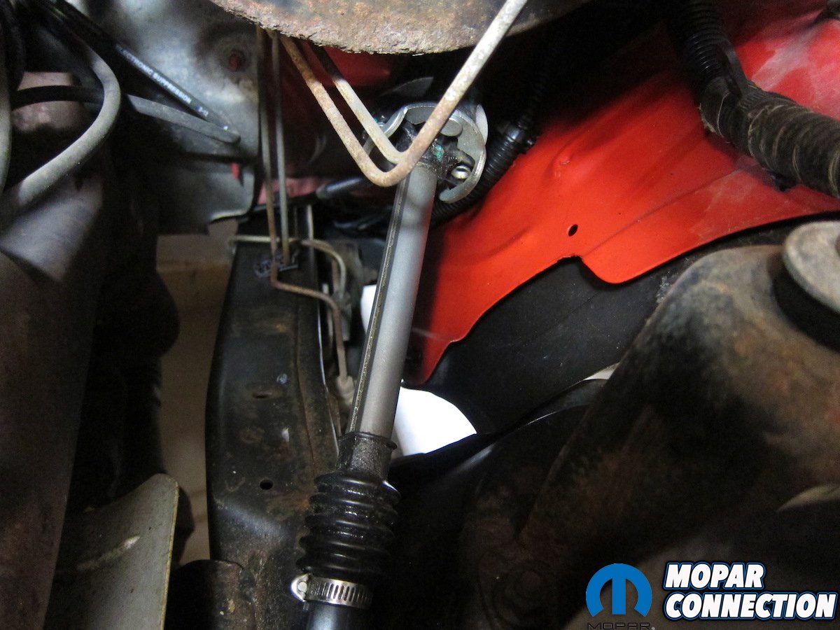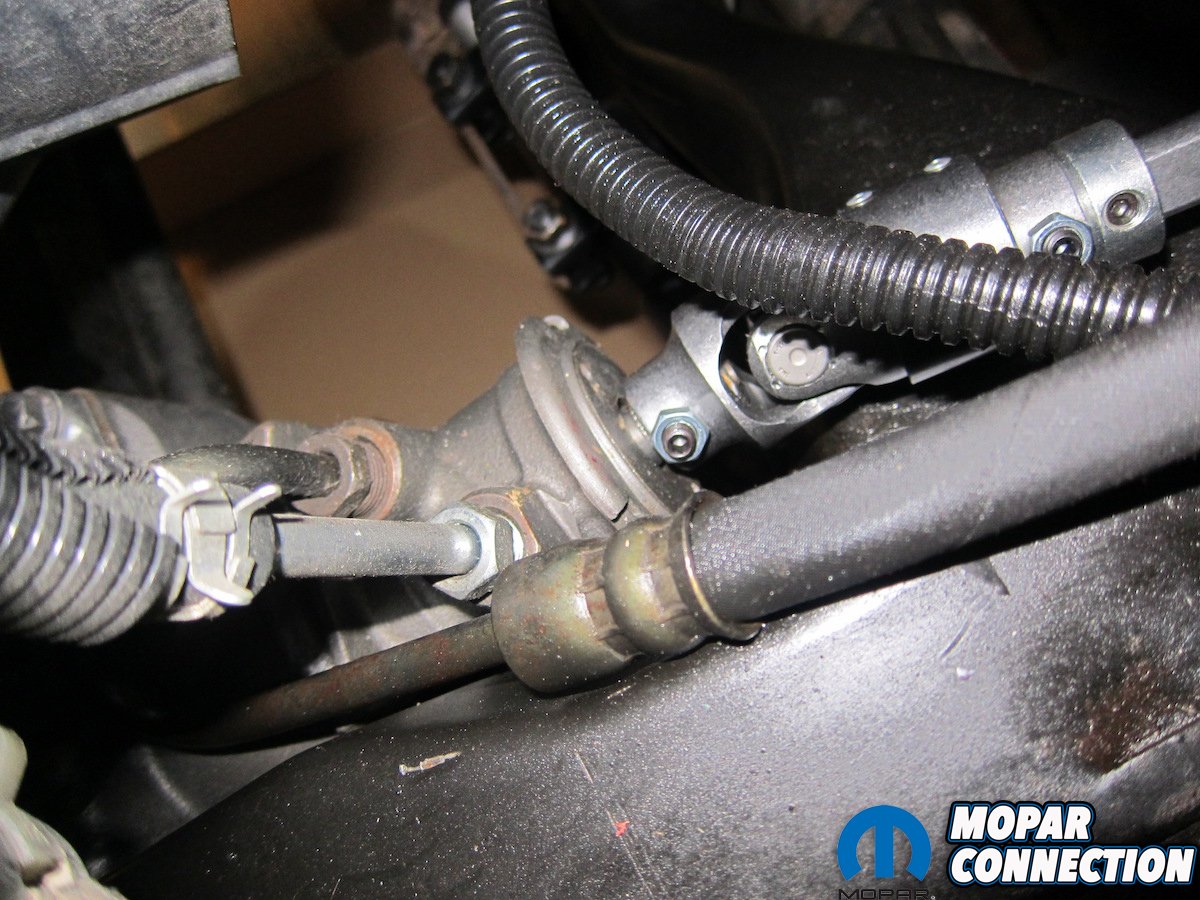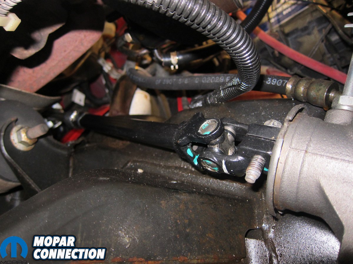 Above: On the steering box side, the set screw was tightened down on its matching flat. While underneath, we slid the upper end of the shaft under the master cylinder and up towards the column.