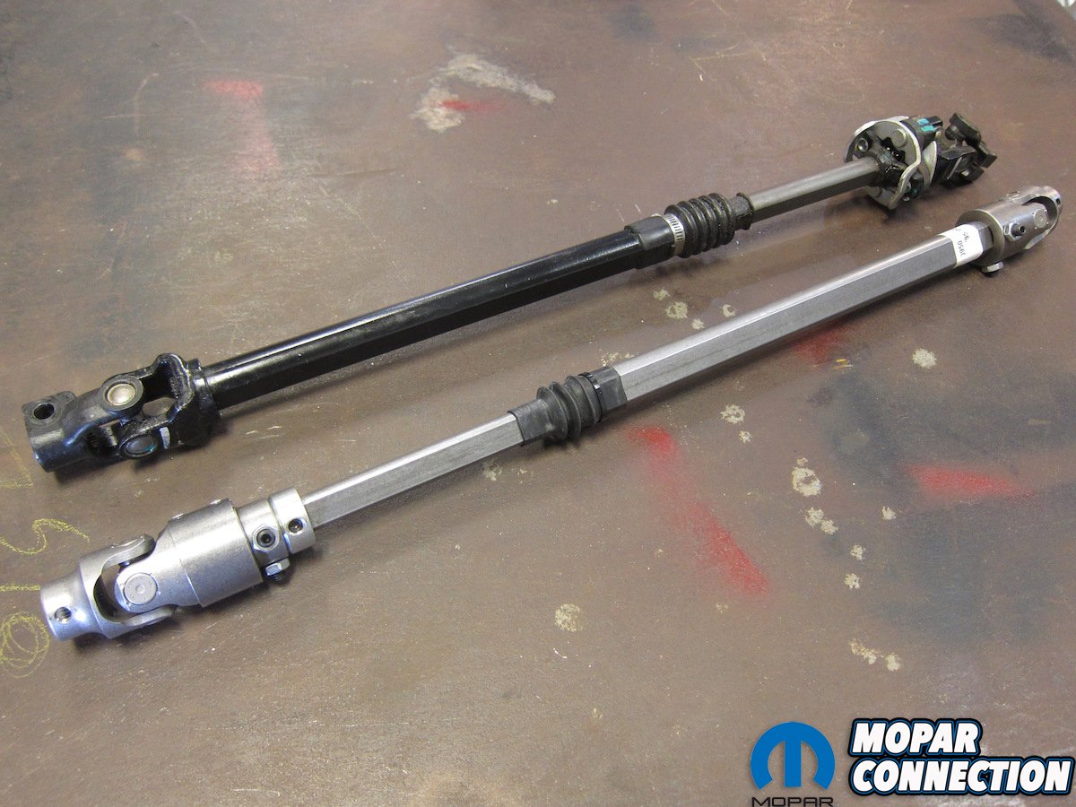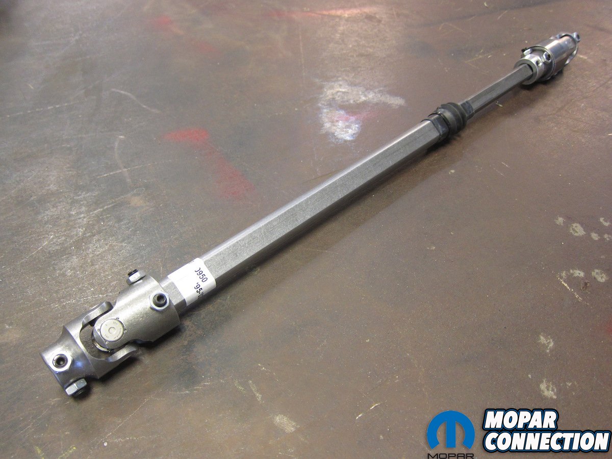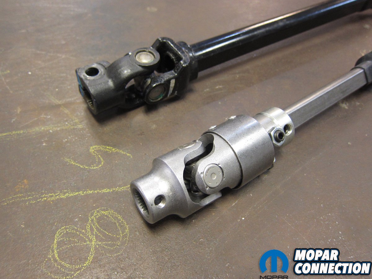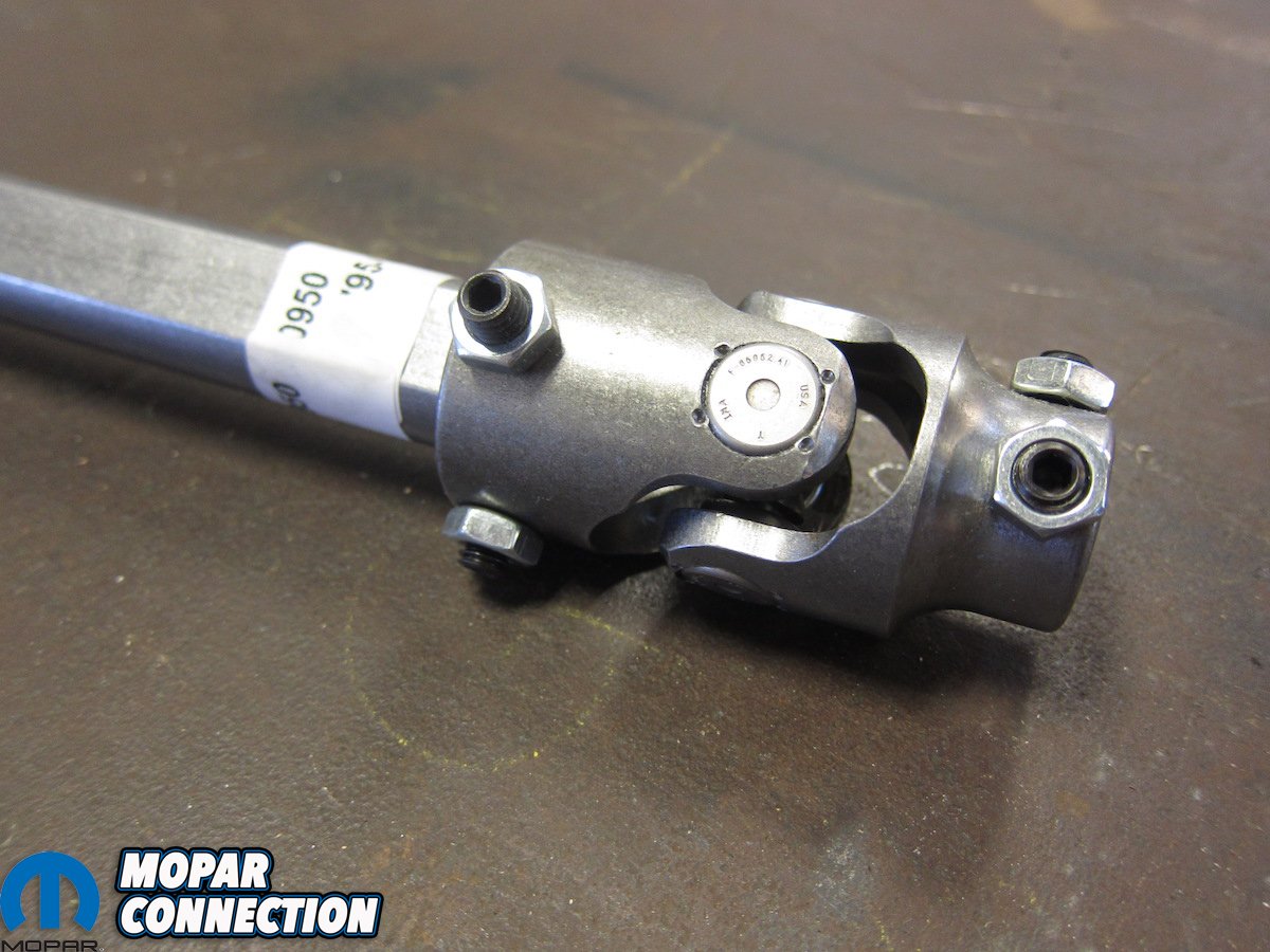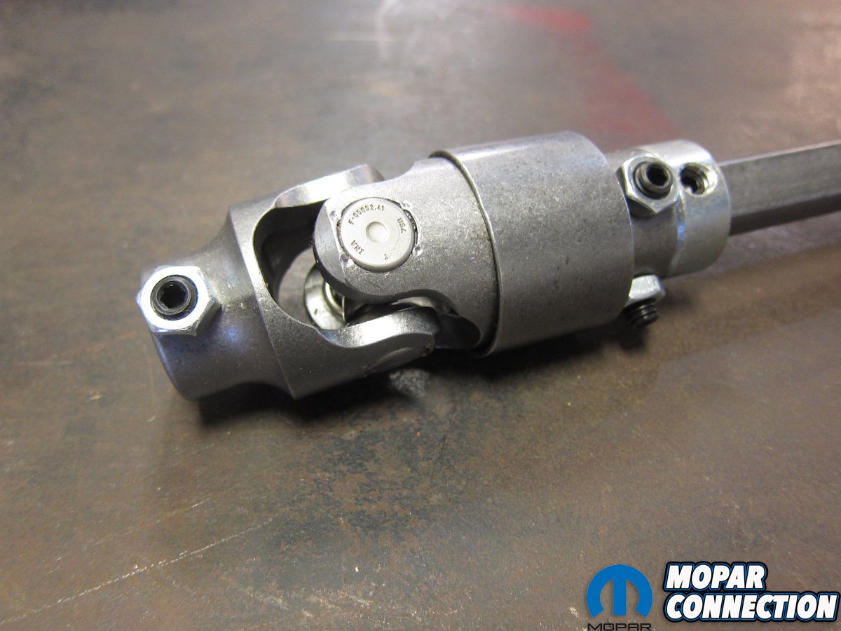 From the factory, the upper portion attaches to the column’s double-D shaft via a pinch U-joint, followed by what is commonly known as a “rag joint.” The “rag joint” is actually a riveted assembly of rubber and steel that acts as a damper for any kind of road or suspension vibration. It’s connected to the male portion of a telescoping shaft who’s joint is covered by an accordion boot. The female end of the shaft runs down to another U-joint that mates to the steering box with a splined, single-bolt pinch connector. In factory form, it’s a decent unit that keeps everything between the ditches. But we weren’t looking for a decent replacement.